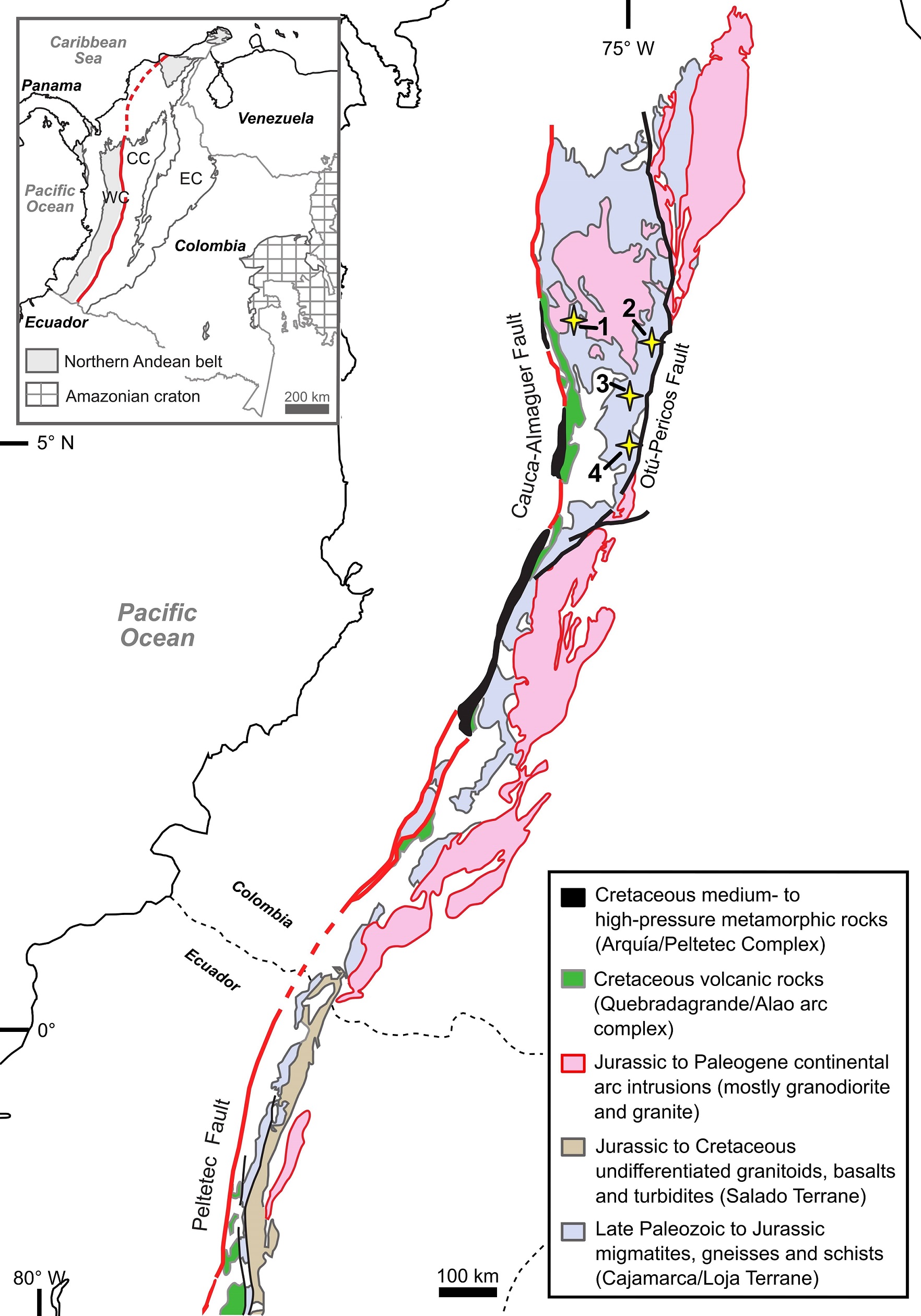 The Central Cordillera hosts a ~N-S-oriented belt comprising medium- to high-grade (Paleozoic to Mesozoic) metamorphic rocks, extending the entire length of the Cordillera (Fig. 1). These rocks constitute the Cajamarca Complex in the sense of Maya and González (1995), and includes pelitic schists and gneisses, quartzites, marbles, and minor amphibolites and migmatites. Zircon U-Pb and amphibole-mica 40Ar/39Ar metamorphic ages within the northern part of the Complex range from ca. 240 to 230 Ma (Vinasco et al.,2006; Restrepo et al.,2011; Martens et al.,2014; Cochrane et al.,2014), whereas the southern part exhibits ages from ca. 158 to 146 Ma (Blanco-Quintero et al.,2014).