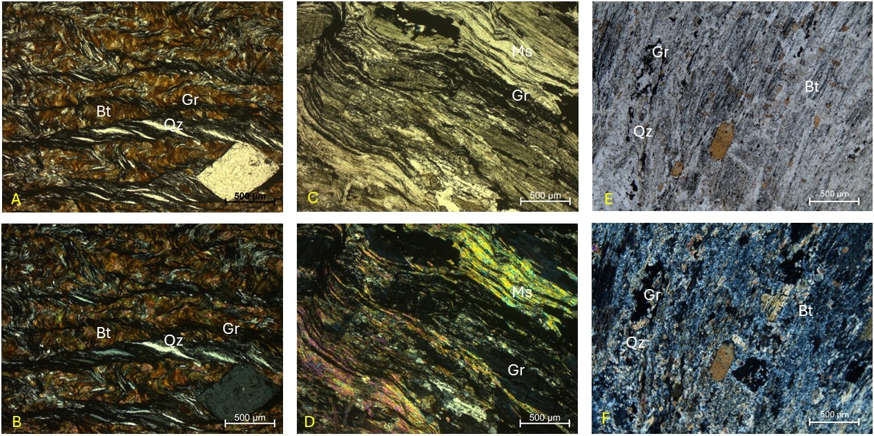 Compositional analyses of the schists reveal a consistent mineralogy across all four areas. Under the microscope, the rocks predominantly consist of muscovite (30-50%), quartz (20-50%), graphite (10-15%), biotite (10-40%), and plagioclase (<5%) (percentages determined by point counting). Such an amount of graphite would make these rocks as an average international deposit (see Gautneb et al.,2020). However, detailed geological mapping of these areas is required. Andalusite may also be present (<3%), so may other accessory minerals such as apatite, zircon, and opaques. The grano-lepidoblastic texture, which defines the schistosity, is characterized by alternating bands of oriented micas and graphite, along with recrystallized quartz (Fig. 2).