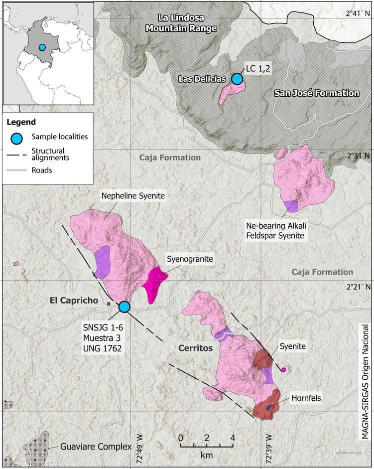 Galvis et al. (1979) were the first to describe silica-undersaturated rocks in the SJGS area of southeastern Colombia, found in the La Lindosa mountain range and the isolated hills of Cerritos and El Capricho (Fig. 2). The unit is composed of diverse syenites, like nepheline syenites, nepheline-monzosyenites, and nepheline-bearing alkali feldspar syenites, as well as quartz-bearing syenites, syenogranites, and quartz-rich granitoids (Amaya López et al.,2021). Amaya López et al. (2021) stated that silica-saturated intrusions would be underrepresented in terms of volume and restricted to the southwestern hills (El Capricho and Cerritos; Fig. 2).