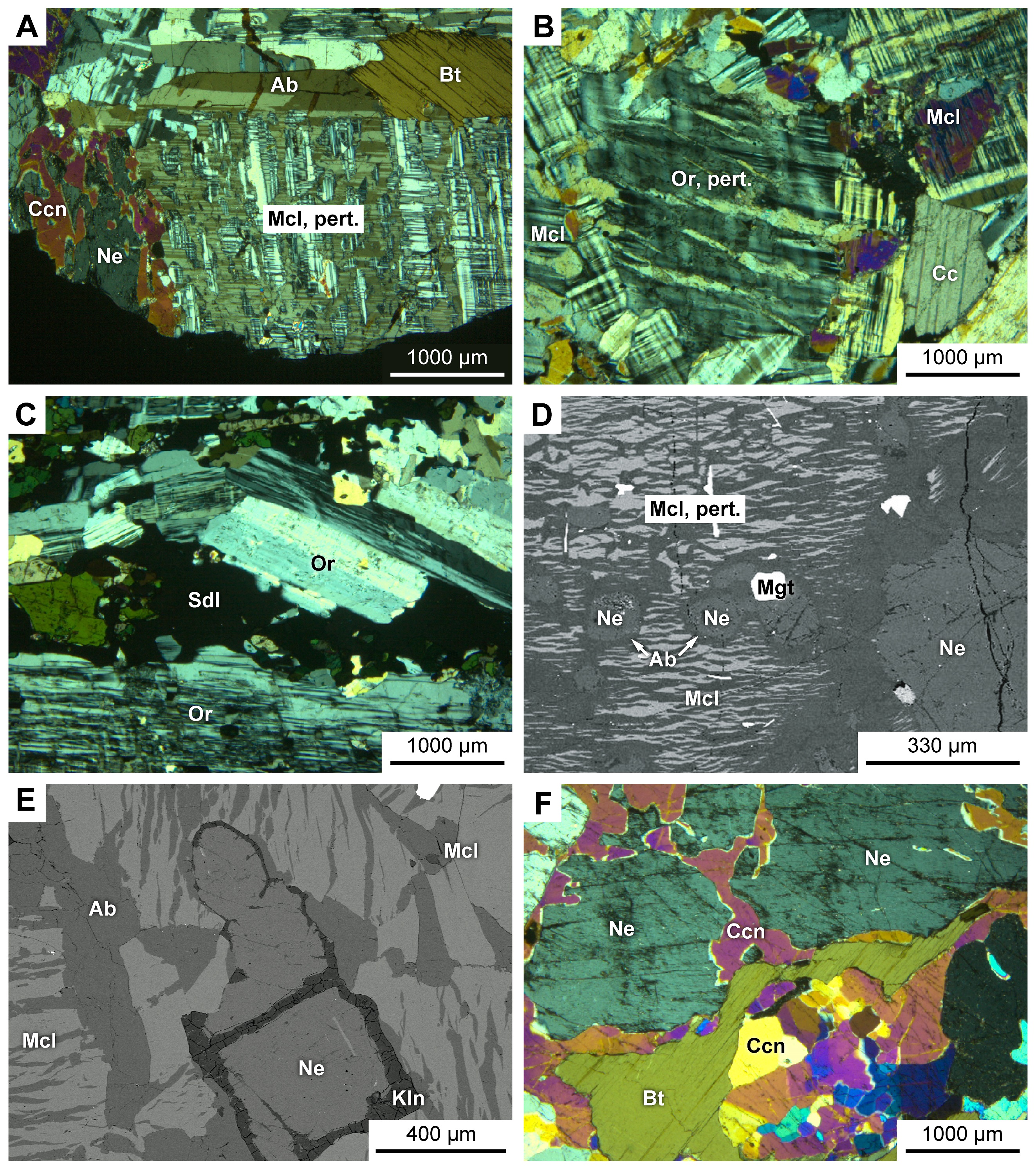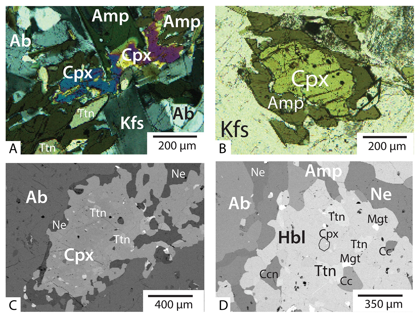 Albite (Ab94-99 An0.3-6 Or0.4-0.5; Supplementary Table S1) occurs as corona (rims) around nepheline (Fig. 3D) and in Kfs or as individual grains (Fig. 3A, 3E, 4A-D), commonly in contact with nepheline, clinopyroxene, microcline, amphibole, and locally with primary calcite (Fig. 3A).