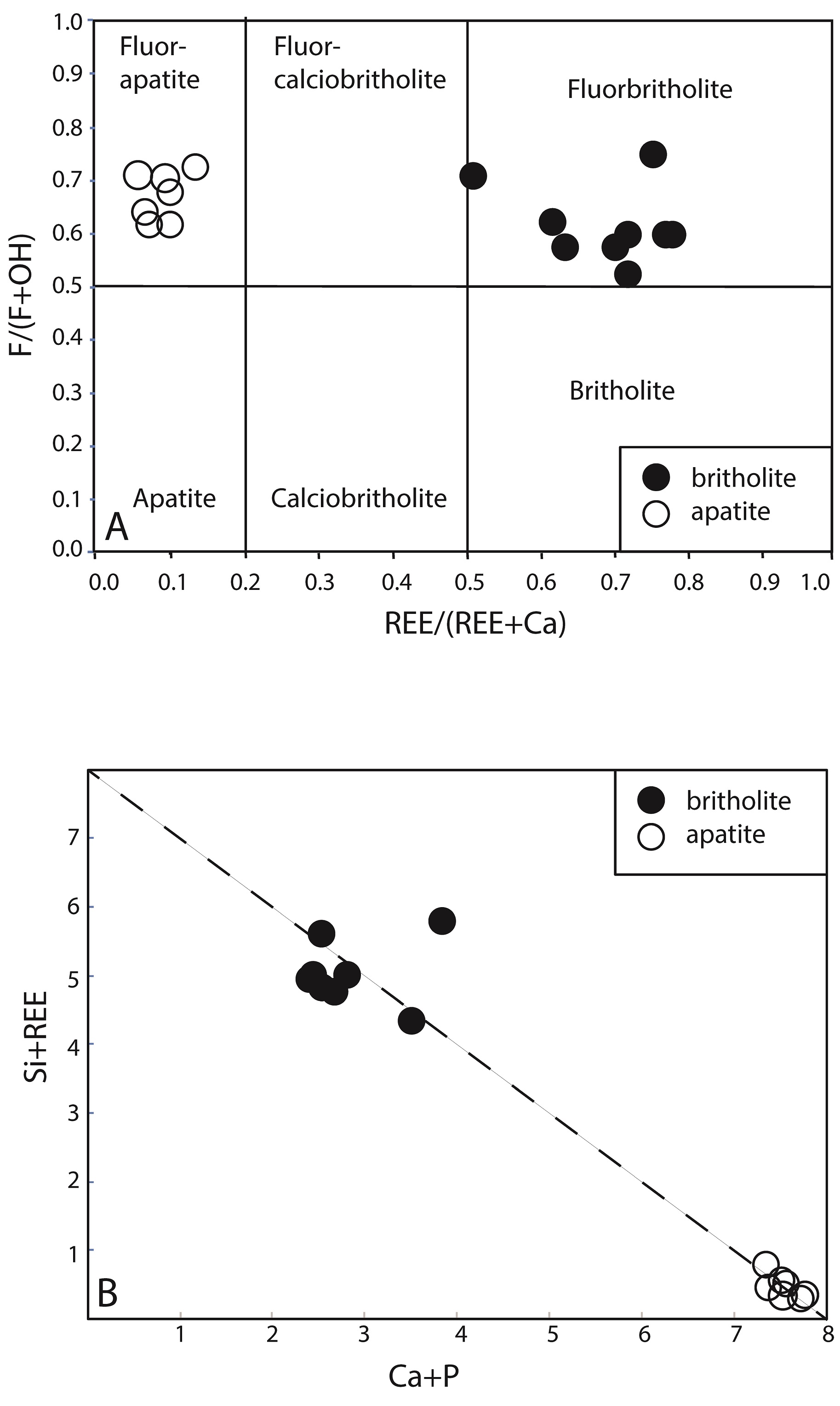 Britholite and apatite are members of the apatite supergroup M5(TO4)3X [M: Ca, Pb, Ba, Sr, Mn, Na, Ce, La, Y; T: P, V, Si, S; X: F, OH, Cl]. It includes the britholite group with the general formula (REE,Ca)5[(Si,P)O4]3(OH, F) (Pasero et al., 2010). Transformation of apatite into britholite is possible by the coupled substitution mechanism (e.g., Ronsbø, 1989; Zozulya et al., 2015, 2017):
