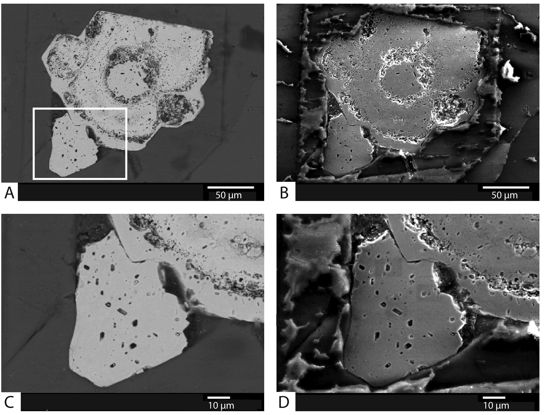 Fig. 9. BSE (A, C) and SE (B, D) images of SJGS pyrochlore crystals. Zoom-ins from A and B are shown in C and D, respectively. Sample UNG 1762.