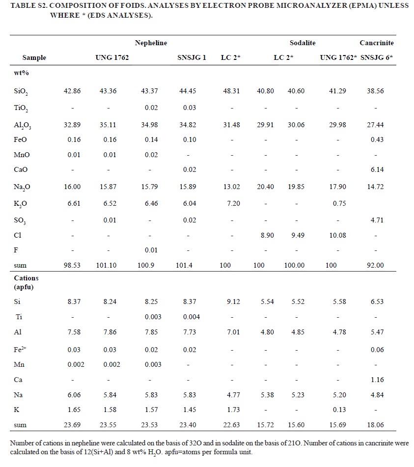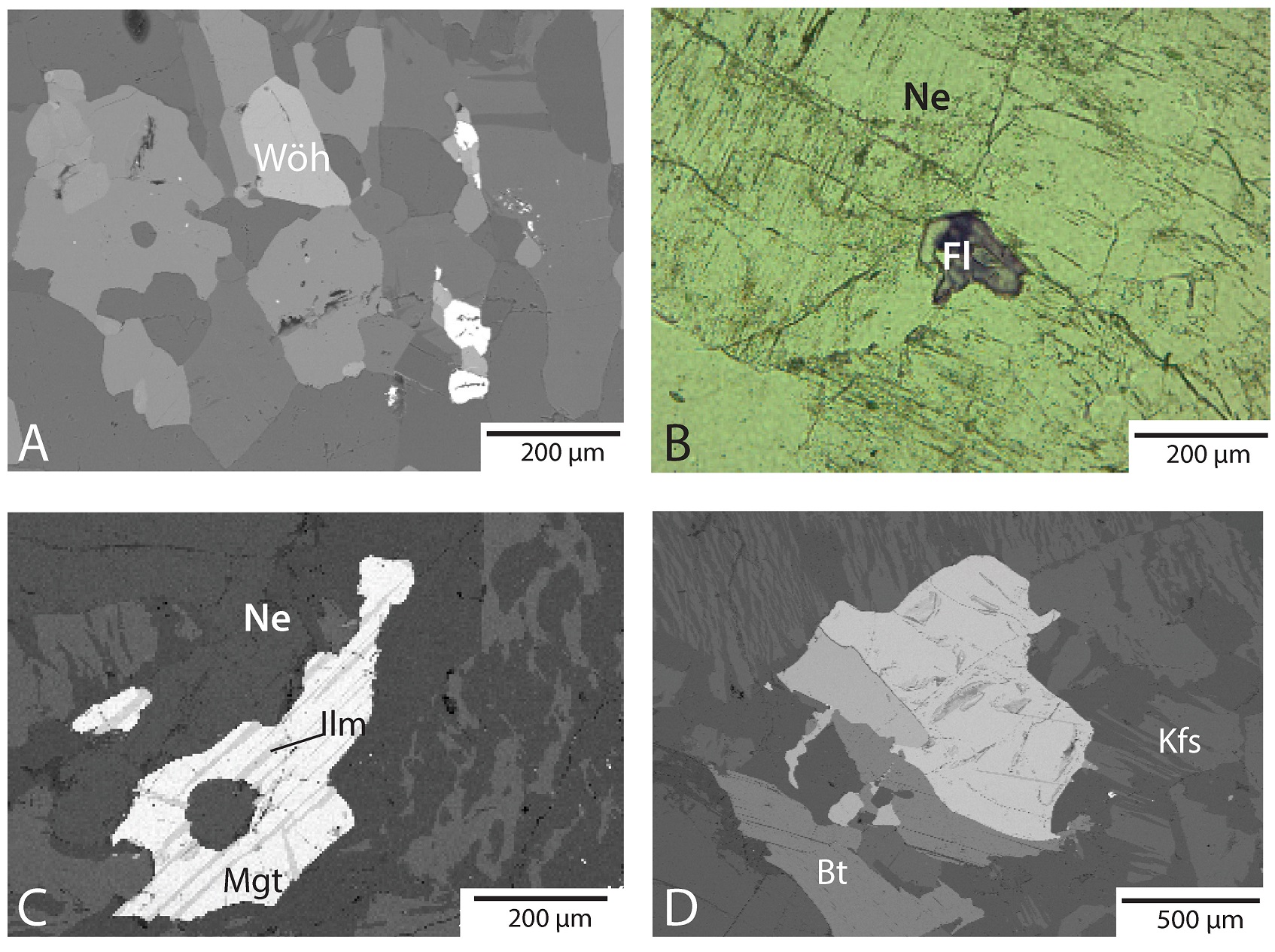 The studied samples are all classified as nepheline-syenites, composed of alkali feldspar (29-65 vol.%), nepheline (15-35 vol.%), biotite (2-9 vol.%), amphibole (0-18 vol.%), and clinopyroxene (0-10 vol.%). The minor minerals are titanite (0-8 vol.%), calcite (0-3 vol.%), cancrinite (0-4 vol.%), and sodalite (0-3 vol.%). Trace minerals with <1 vol.% are restricted to individual samples and consist of pyrochlore, columbite, euxenite, apatite, britholite, ancylite-Ce, wöhlerite, rhodochrosite, strontianite, fluorite, zircon, magnetite, ilmenite, and pyrite.