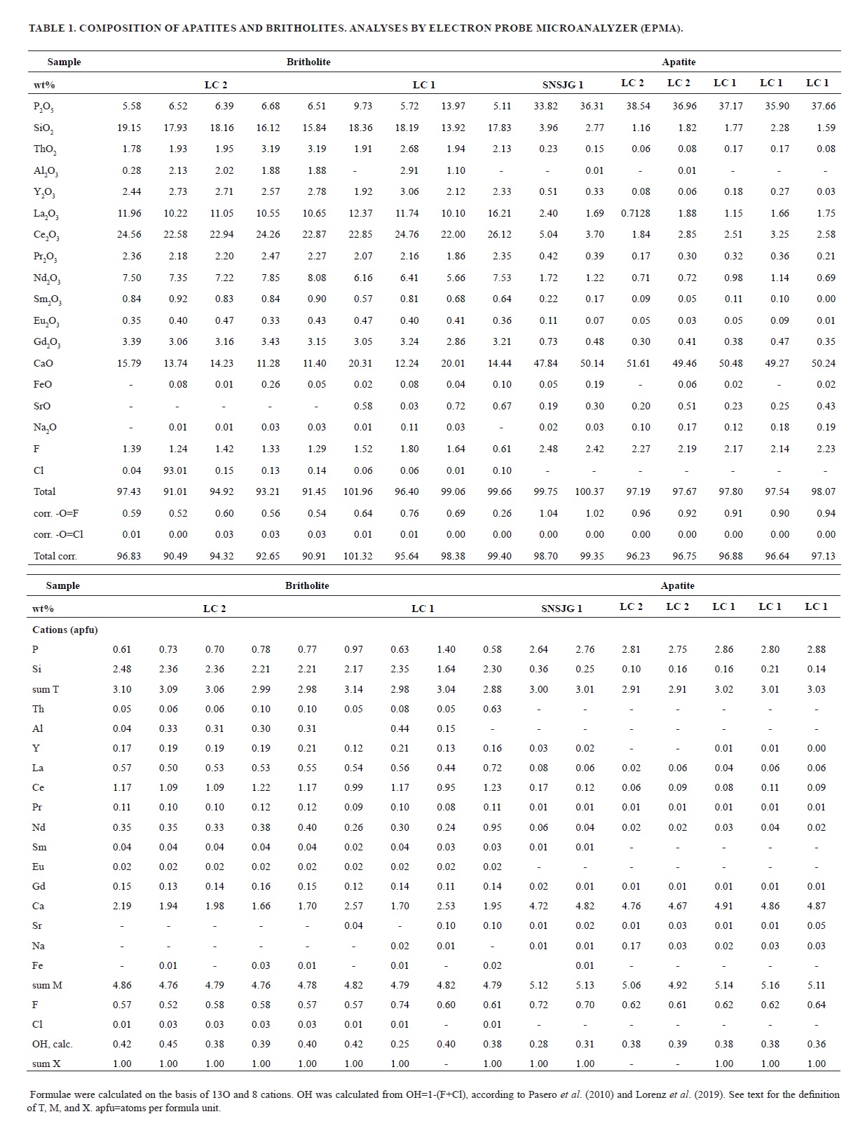 Lorenz, M.; Altenberger, U.; Trumbull, R.B.; Lira, R.; López de Luchi, M.; Günter, C., Eidner, S. 2019. Chemical and textural relations of britholite- and apatite-group minerals from hydrothermal REE mineralization at the Rodeo de los Molles deposit, Central Argentina. American Mineralogist 104 (12): 1840-1850. https://doi.org/10.2138/am-2019-6969
