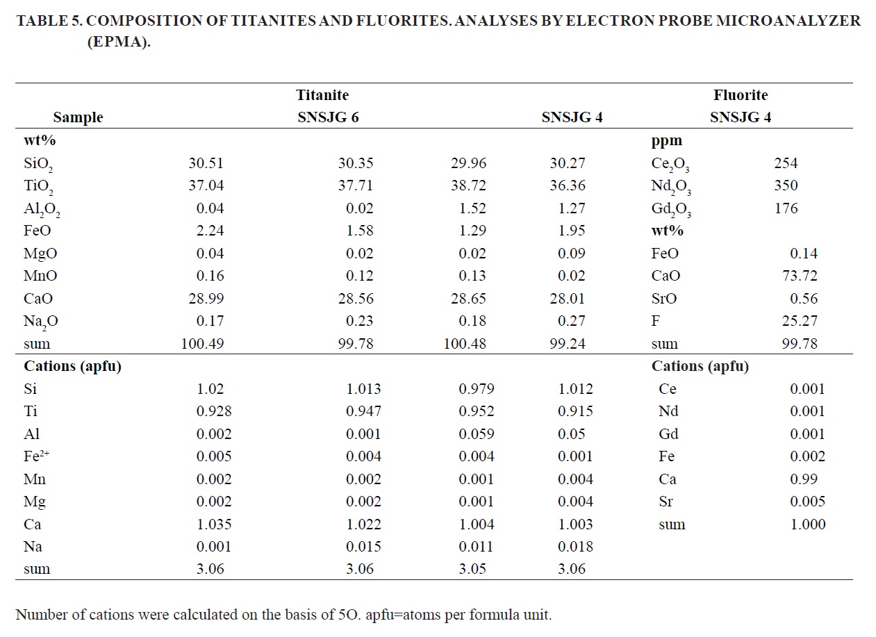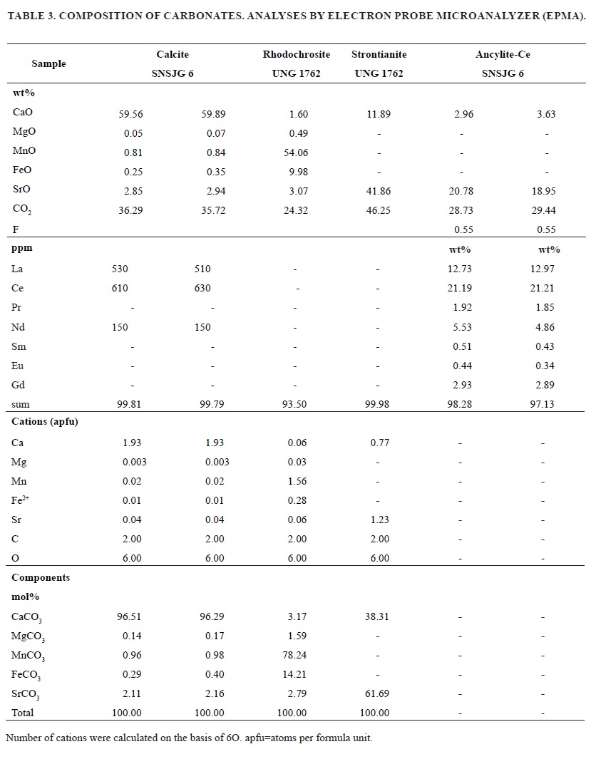 Ancylite-Ce appears as individual grains with sizes <200 µm and <400 µm as aggregates (Fig. 11D). It typically occurs as inclusions, but due to its (OH) content it is probably of secondary origin, so the interpretation of an earlier crystallized phase would possibly be a mistake result of a cut effect. The chemical composition of a SJGS ancylite-Ce crystal is shown in table 3.