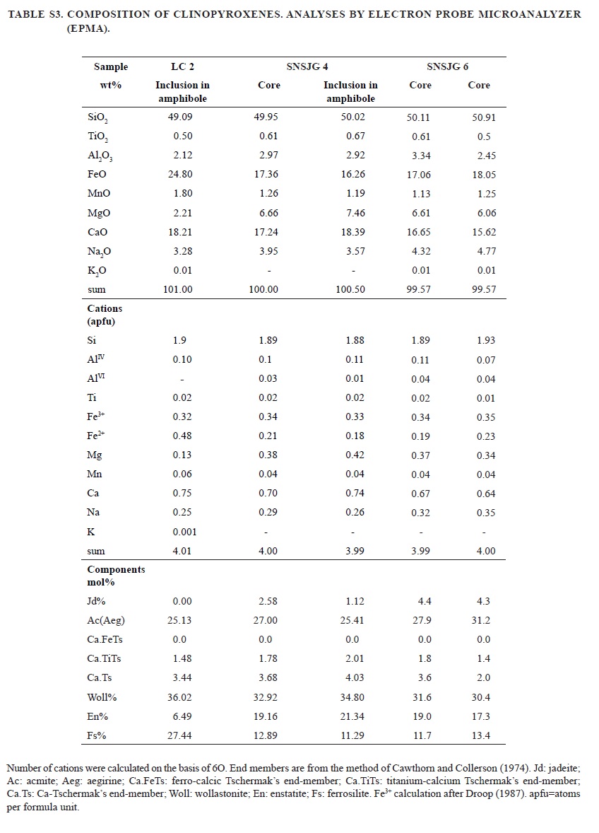 The textural and compositional characteristics of the SJGS minerals suggest different magmatic stages. We propose an early high-temperature crystallization stage dominated by the growth of nepheline, sodalite, potassium feldspar (orthoclase), Fe-rich clinopyroxene, albite, apatite, amphibole, and biotite. Inclusions of calcite and Nb-rich minerals (pyrochlore, columbite, and euxenite) indicate that they were formed during this early stage as well.