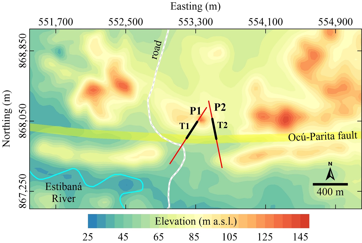 The conductive surface horizon (i.e., 4.07-27.19 Ωm) presented in the T2 tomography (Fig. 3B) between positions ~459 and 569 m can be associated with the surface soil layer identified in figure 3A. At the beginning of this profile, between positions 334 and ~459 m, the conductive horizon occupies the maximum vertical extension so that it could correspond to the shallow soil layer mentioned above and followed by a second conductive horizon, possibly a layer of volcanic material, with calculated electrical resistivity values <27.19 Ωm. Finally, the resistive anomaly identified in this second profile is associated with the altered intrusive rock body, whose abrupt end at position ~459 along the profile may likely represent the Ocú-Parita fault (Fig. 4B).