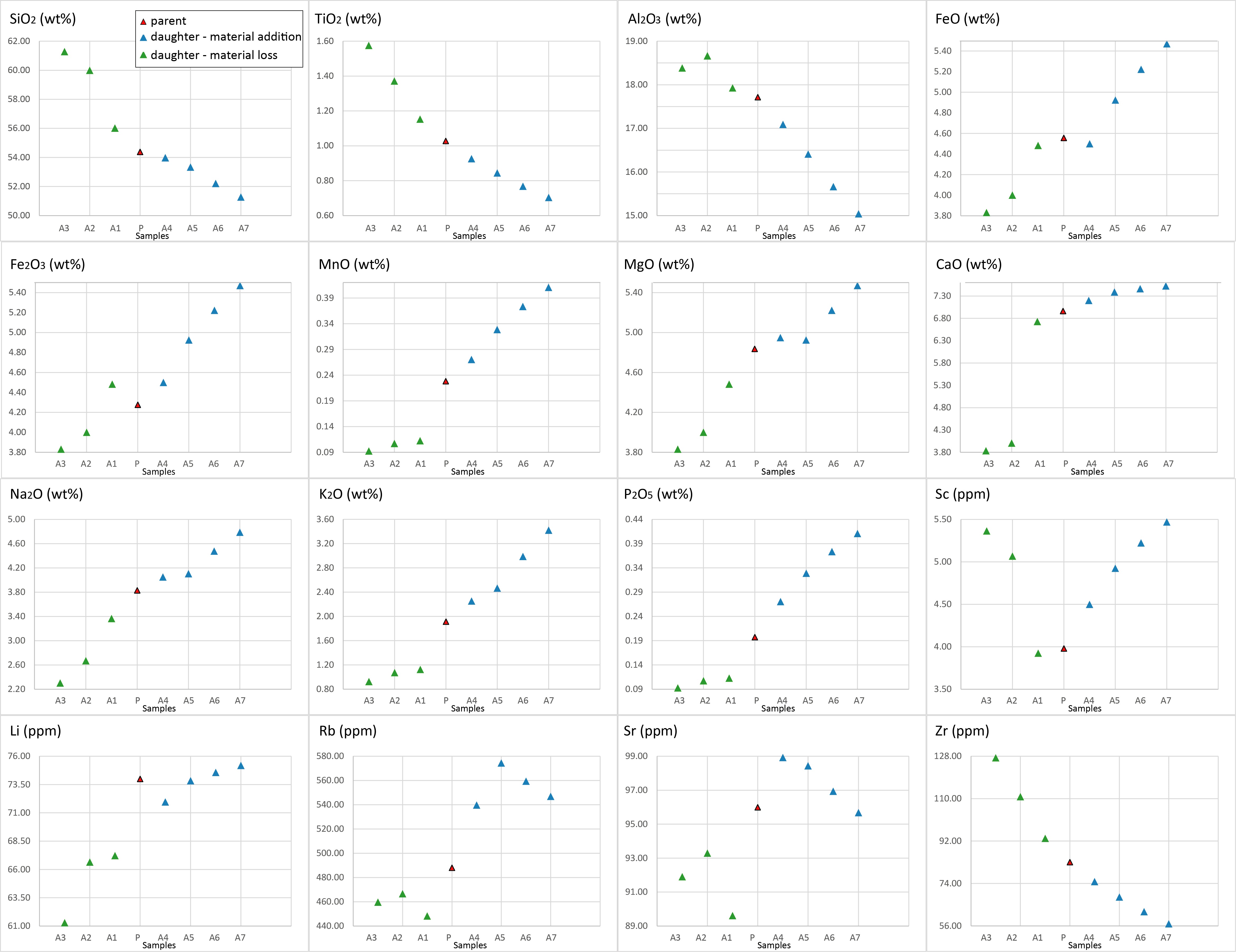 The element masses for each of the eight numerically generated samples are presented in figure 1 (TiO2 and Zr have the same masses for all samples because of their conserved assumption; see above). When these element masses are transformed into concentrations (Fig. 2), the element concentrations in the daughter samples underwent either enrichment or dilution when compared to those of the parent rock, no matter if the element was actually conserved or not (cf. Fig. 1). This means, not only did the system size of the rocks change, but also did all the element concentrations (Fig. 2), particularly TiO2 and Zr. It is worth noting that SiO2, Al2O3, TiO2 and Zr decreased in samples that have added mass, while the rest of the other elements displayed an overall gradual enrichment (Fig. 2).