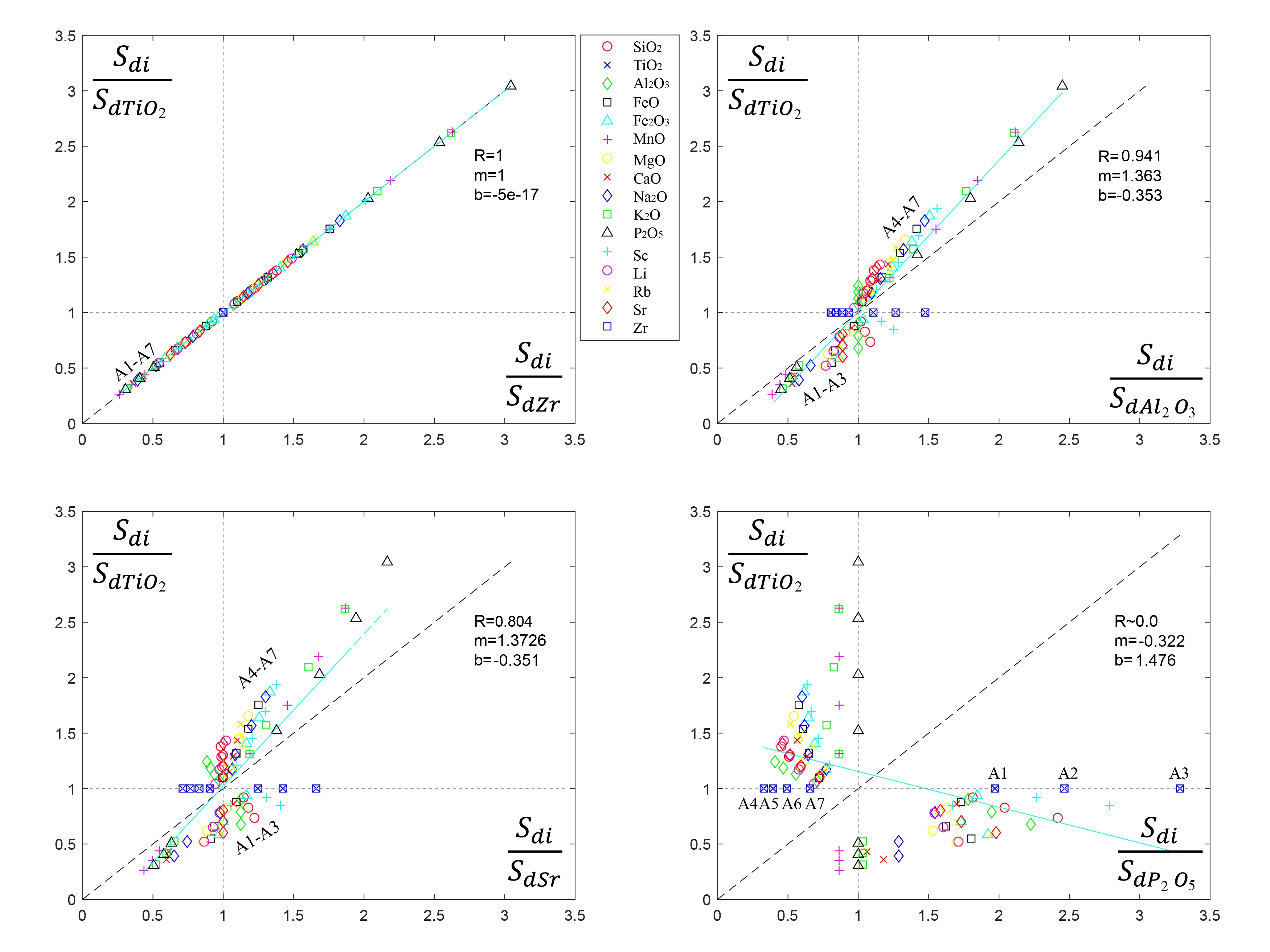 Figure 4 presents the daughter system size ratios for the same sixteen elements presented in figure 3 compared with the daughter system sizes for Sdi /SdTiO2 (vertical axes) and Sdi/SdZr, Sdi/SdAl2O3, Sdi /SdSr and Sdi /SdP2O5 (horizontal axes) shown in table 2. Results indicate that only the conservated element pair (TiO2-Zr; upper left panel) estimates the same rock sizes for every sample. Although other element pairs display relatively high correlation coefficients (e.g., Al2O3), the data define trends with slopes that depart from unity and/or have intercepts far from zero. The plots for Sdi /SdTiO2 vs. Sdi /SdAl2O3, Sdi /SdTiO2 versus Sdi /SdSr, and Sdi /SdTiO2 vs. Sdi /SdP2O5 show that the estimated daughter system size ratios are higher than 1 in samples A1-A3 and lower than 1 in samples A4-A7.