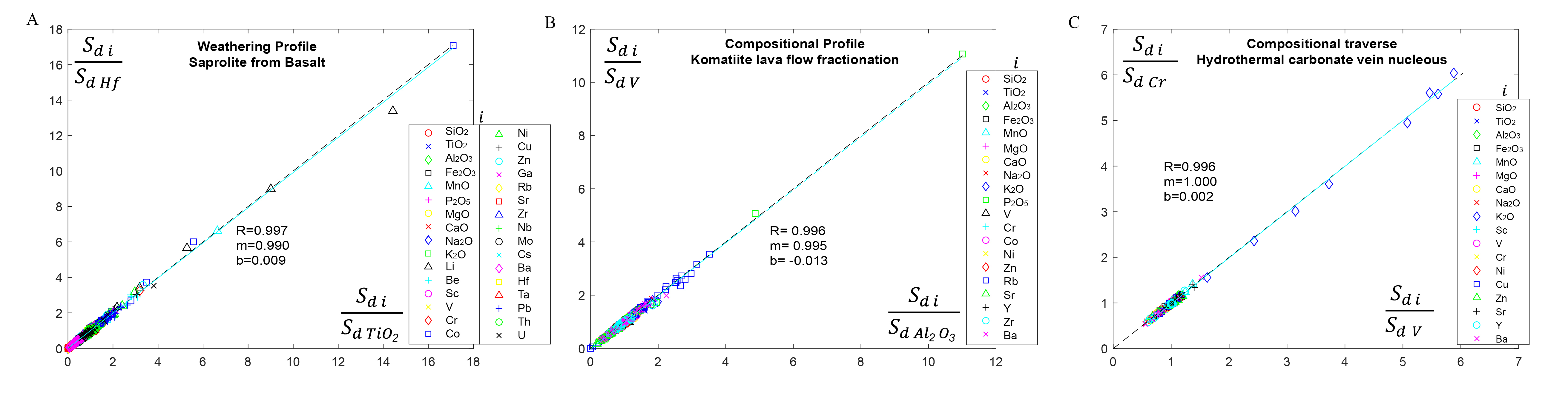 Following the above reasoning, when a pair of elements k1 and k2 are plotted on a Sdi /Sdk1 versus Sdi /Sdk2 diagram, the daughter system size ratiosfor the conserved elementwill plot at unity for all samples, and when both elements are conserved, all plotted data will fall in a line with a unity slope. In addition, if the element in the ordinate denominator is a conserved element, samples with loss of material will plot below the unity line trend, whereas those with material gain will plot above the unity line trend.