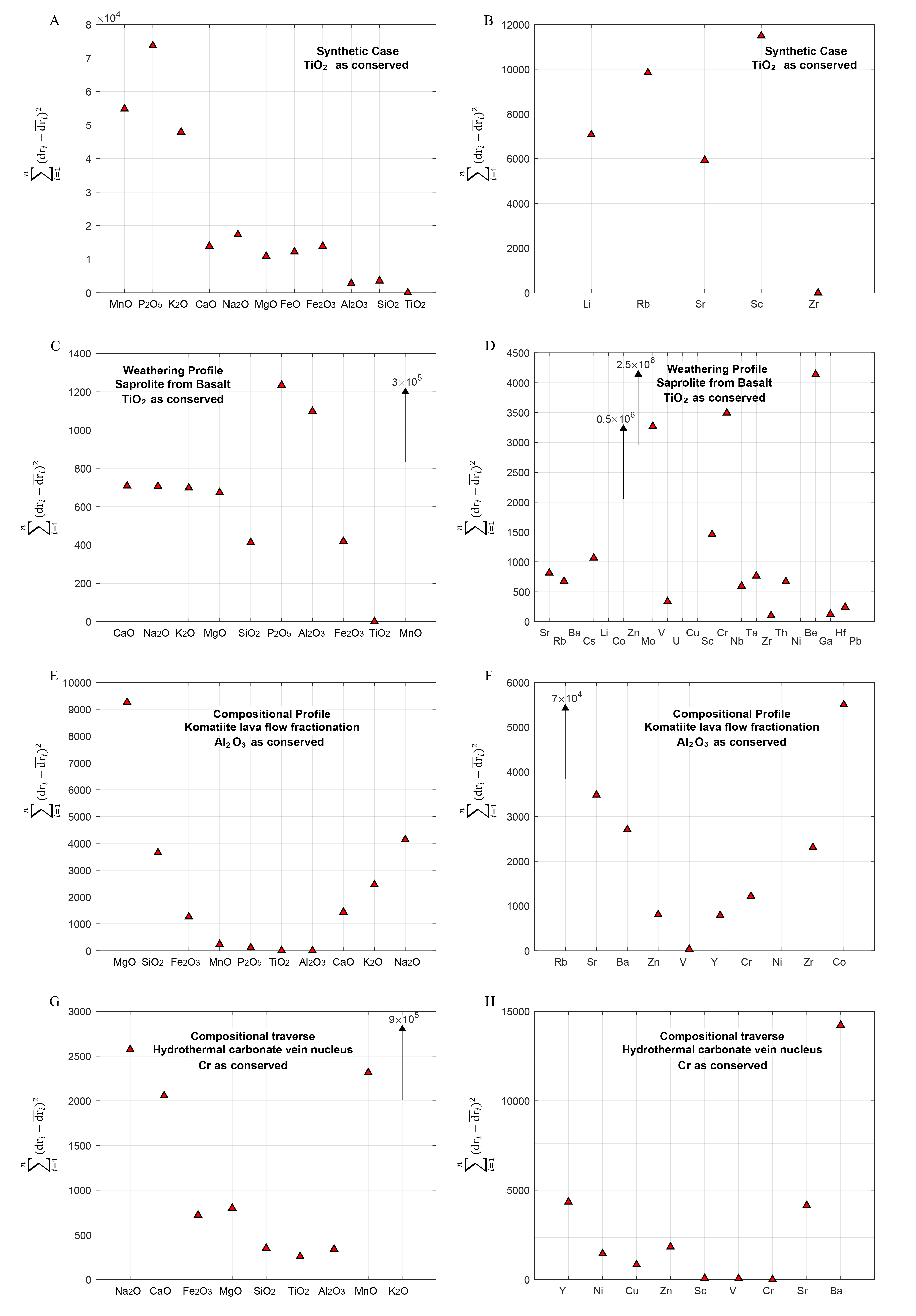 The Isomass method firstly involves the estimation of the daughter system size (Sdi), from which an estimate of the relative material transfer (dri) can be made. The sum of squares of these relative material transfers for all the elements analysed provides a quantitative measure of the conserved character of every element. Figure 7 illustrates how a conserved (or nearly conserved) group of elements minimizes the relative material transfer sum of squares (e.g., Sc-V-Cr in the hydrothermal alteration case). This latter procedure identifies the elements most involved in material transfer.