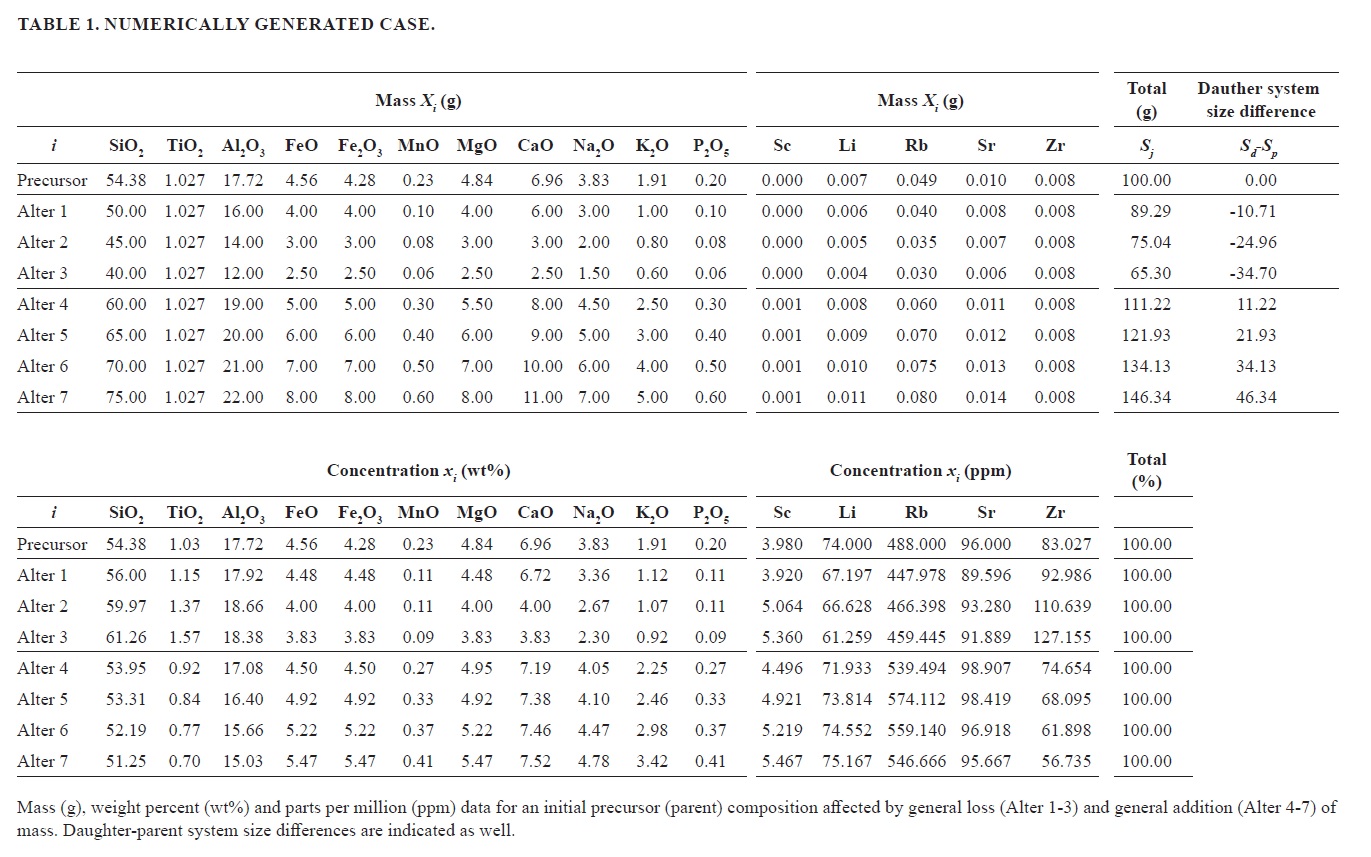 The numerically generated parent rock contained 16 elements (11 major oxides and 5 trace elements). It was generated by assuming an initial rock mass (Sp ) of 100 g (Table 1). This parent rock was subject to material transfer, producing seven daughter rocks (Alter 1 to Alter 7 in Table 1) with new element masses (Sdi). Only the masses of TiO2 and Zr remained constant and are thus said to be conserved. The system size of some of these daughter samples (Alter 1 to Alter 3) decreased when compared to the parent rock, whereas the size of the others increased (Alter 4 to Alter 7). These parent and daughter element masses were then converted into concentrations and normalized to 100%, producing concentrations in weight percentage (wt%) for the major oxides and parts per million units (ppm) for the trace elements (Table 1). This numerically generated dataset is meant to represent typical whole-rock analysis results obtained in routine lithogeochemical surveys.