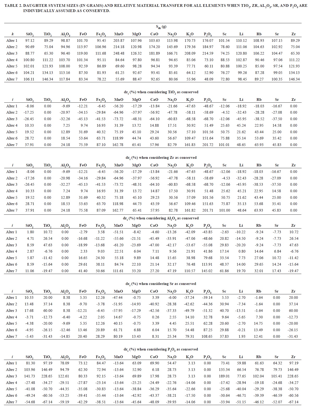 As a rule, only the conserved element will correctly estimate the daughter system size (see Equation 6). The ultimate criterion to identify the conserved group of elements involves finding those elements capable of fulfilling the following requirements: (1) the calculated element material transfer (dXk ) or the relative material transfer (drk ) are smaller than measurement error; (2) the estimated daughter system size ratios (Sdi /Sdk ) are also smaller than measurement error; and (3) the daughter system size ratios calculated for two hypothetically conserved elements k1 and k2 should be nearly identical for every sample and element (i.e., they exhibit the highest correlation, a best-fit slope closest to unity, and a best-fit intercept closest to zero).