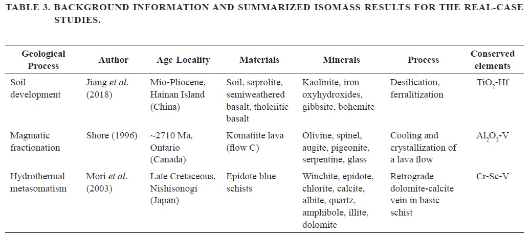 The real-case datasets investigate material transfer associated with soil development (Jiang et al., 2018), magmatic fractionation (Shore, 1996), and hydrothermal metasomatism (Mori et al., 2003). The background information and conserved elements validated by the Isomass method are summarized in table 3. Although numerous geological examples of material transfer are available in the literature (Alderton et al., 1980; Smith et al., 1982; Aguirre, 1988; Ague, 1991; Magloughin, 1992; Goddard, 1993; Condie et al., 1995; Christidis, 1998; Bach, 2001; Oliver et al., 2004; Malviya et al., 2006; Liu et al., 2016), the specific studies mentioned above were chosen due to the large number of elements analysed, good knowledge about the mobility that these elements underwent, and the presence of a conserved element.