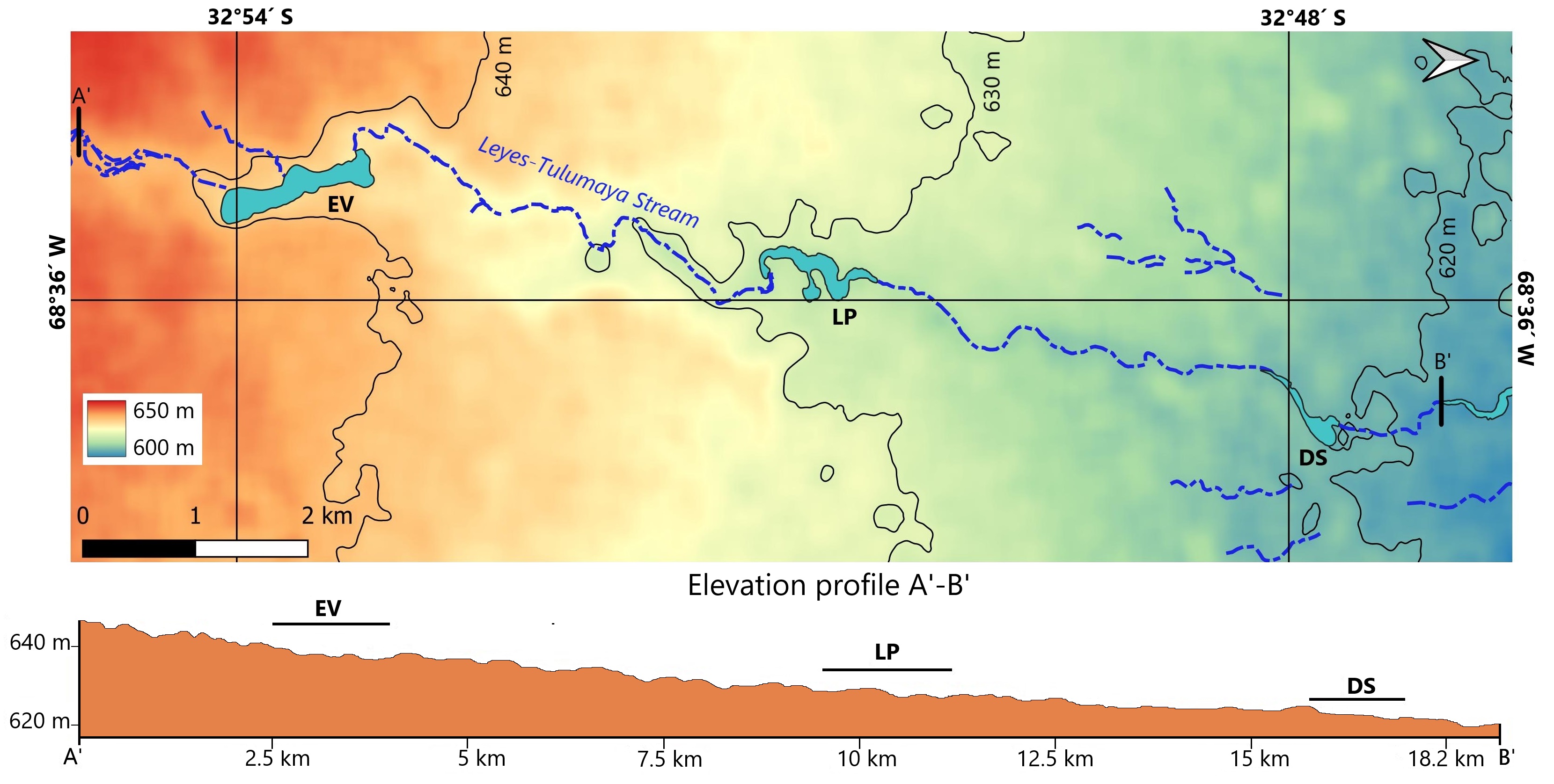 The topographic profile of the Leyes-Tulumaya stream along ~18 km shows a progressive elevation decrease towards the north from a maximum of 644 m a.s.l. in the southern area to a minimum of 617 m a.s.l. in the northern area (stream slope of 0.086°) (Fig. 3). Therefore, groundwater flows from south to north, propelling that lakes located at lower altitudes have more stable areas (Gomez et al., 2024).