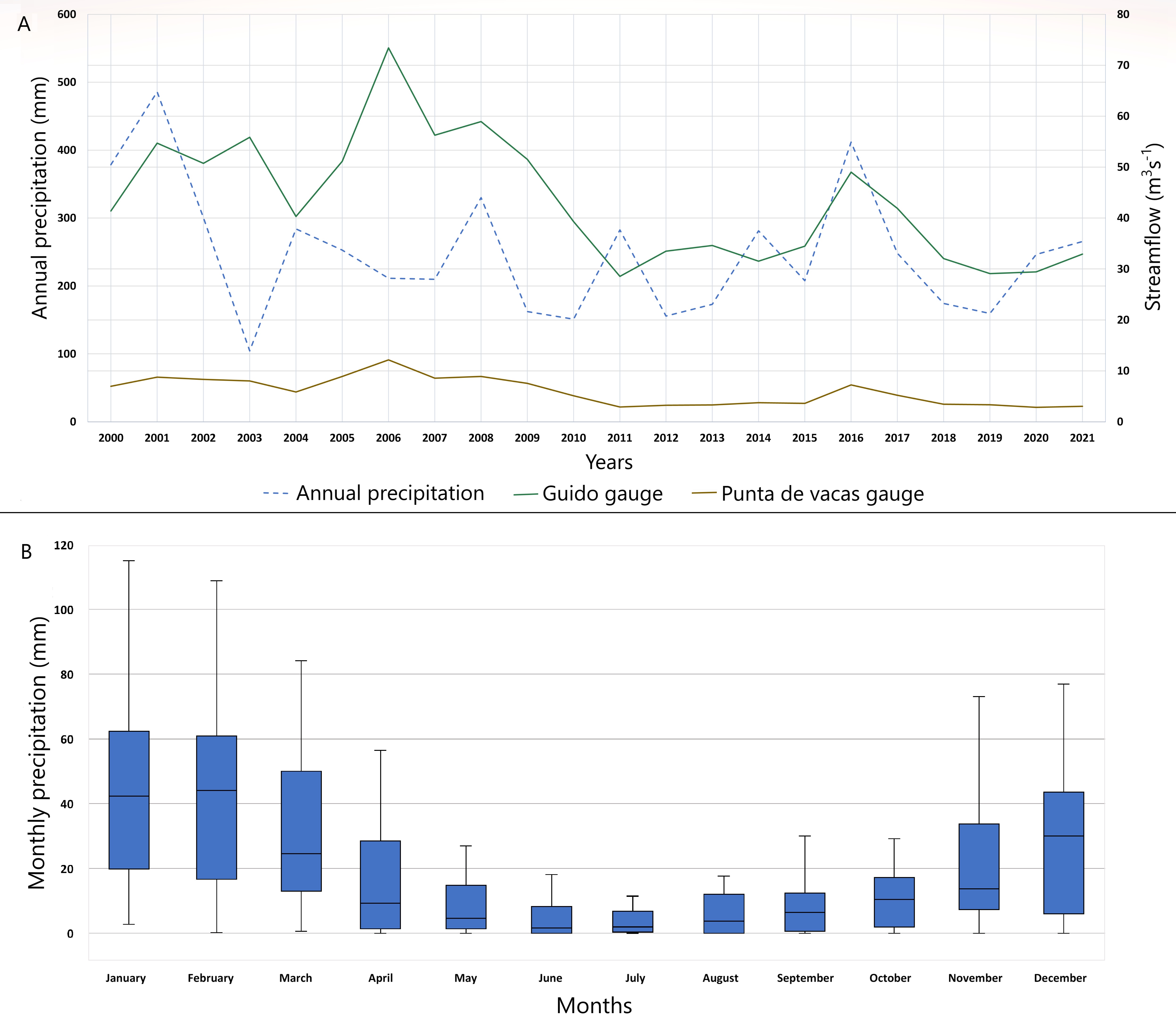 Cumulative annual and monthly precipitation data were obtained from the Mendoza Aero meteorological station (32°50’ S/68°48’ W, 700 m a.s.l.; series 1956-2021) due to its proximity to the study area (see location in Fig. 2). Snow precipitation data (taken from the Argentinian and Chilean Andes Snow Observatory platform, https://observatorioandino.com/nieve/) was not included within the analyzed climatic variables due to a strong correlation with the Mendoza River streamflow data for the period 2000-2022. This correlation is not new, being discussed in Masiokas et al. (2006), among others.