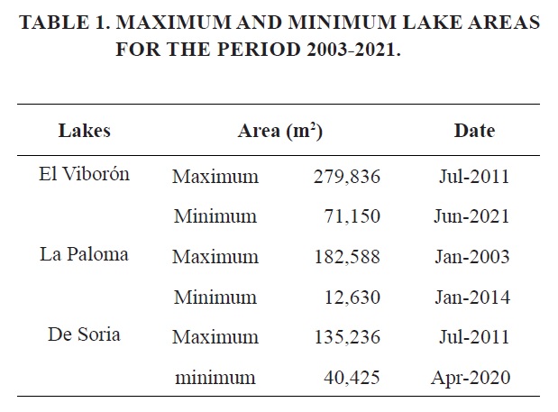 The lake area changes along the Leyes-Tulumaya system reveal a similar evolution although at different rates (Fig. 4). The El Viborón lake, elongated in a north-south direction, reached a maximum extent in July 2011 (~280,000 m2) and a minimum in June 2021 (~70,000 m2) (Figs. 4 and 5; Table 1). This lake showed area variations of 40% at the beginning of the record up to 75% at the end of the period analyzed. After a transient recovery in September 2021, this lake dried up in May 2022. The La Paloma lake, characterized by a meandering shape (Fig. 4), had its maximum area in January 2003 (~180,000 m2) while its minimum was recorded in January 2014 (~12,000 m2) (Figs. 4 and 5; Table 1). This lake showed area variations close to 90% (Fig. 5). The De Soria lake, the northernmost of the three, reached its largest surface area in July 2011 (~135,000 m2) and its smallest in April 2020 (~40,000 m2) (Figs. 4 and 5; Table 1). Water area variations of up to 70% were determined (Fig. 5).