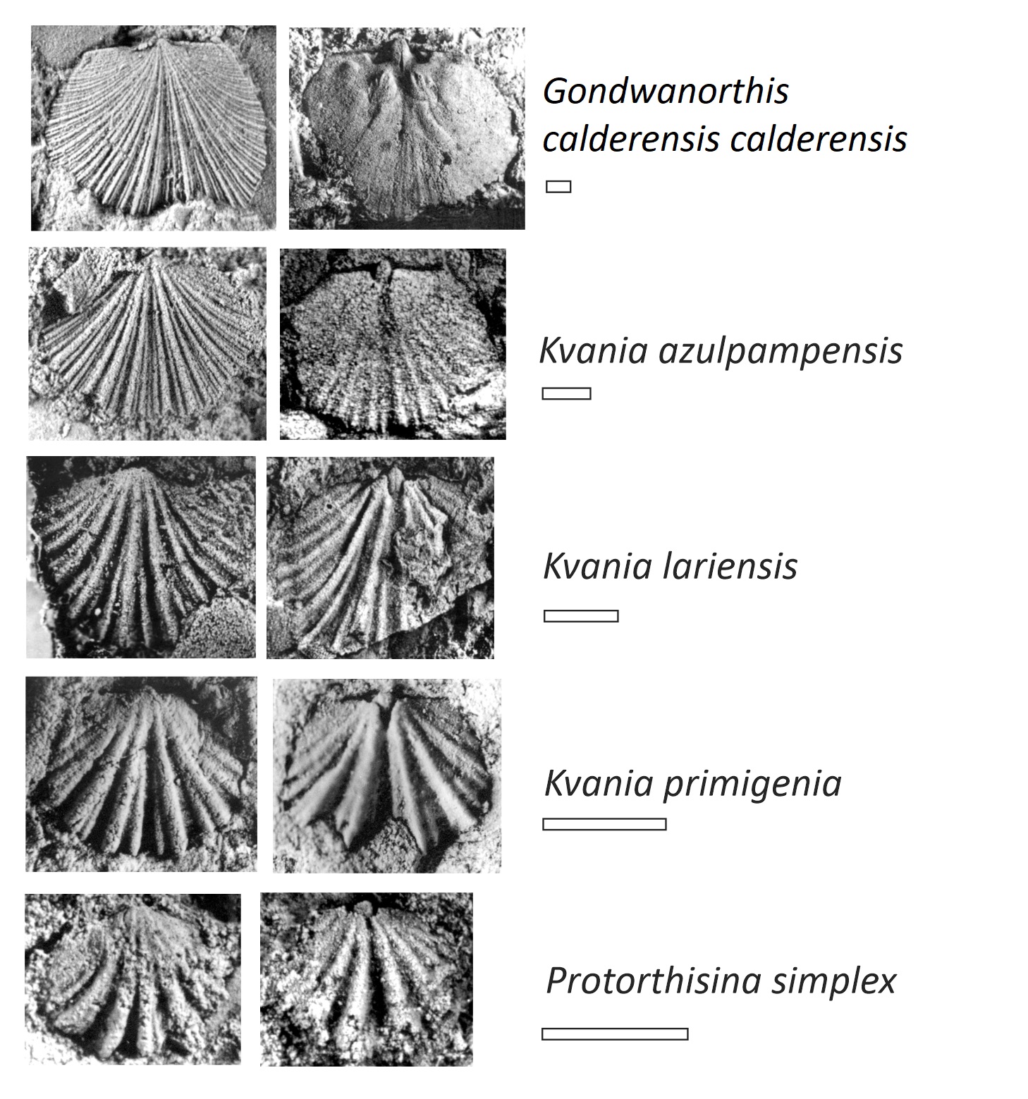 Figure 4 shows the species succession and morphologic changes that took place through the Furongian and early Tremadocian of the Central Andean basin. Protorthisina simplex is likely to be the basal taxon of the lineage. It is characterized externally by its minute subcircular shell ornamented by few, up to ten simple ribs, occasionally dichotomized distally. Internally it is distinguished by the brachiophore bases forming a minute septalium. The inferred descendent species Kvania primigenia has a somewhat larger shell and the rib number increases to 18-20. Internally, the septalium is larger than in Protorthisina and, in later growth stages, brachiophore plates become separated medially (Benedetto, 2007b). This species is morphologically intermediate between P. simplex and the succeeding Kvania lariensis, in which the rib number increases to 25-30, and the brachiophore bases tend to become subparallel or slightly convergent anteriorly forming a narrow subrectangular notothyrial chamber (Figs. 4 and 5). The latter feature is considered diagnostic of the genus Kvania. The next step in the evolutionary lineage is represented by Kvania azulpampensis, which always occurs above the last documented appearance of K. lariensis. This species is larger than K. lariensis and the costellae are more numerous, totalizing up to 45 (Fig. 4). Although the dorsal interiors of both species are quite similar, the notothyrial chamber in K. azulpampensis is well developed at all ontogenetic stages. According to the phylogenetic hypothesis detailed here, K. azulpampensis gave origin to Gondwanorthis calderensis (Benedetto), whichis characterized by a variably fascicostellate or parvicostellate ornament forming well-defined bundles distally, the number of costellae counted at valve margin ranging from 65 to 78. The notothyrial chamber in juvenile individuals is small and subrectangular, and it is delimited by blade-like, subparallel brachiophpore plates. As they grow, the lateral apical cavities become gradually filled by secondary deposits masking the brachiophore bases, which are now confined to the posterior part of the notothyrial platform (Fig. 4). It is remarkable that juvenile specimens of G. calderensis strongly resemble the adults of Kvania azulpampensis in their subrectangular notothyrial chamber flanked by long subparallel brachiophore bases, which suggests that G. calderensis originated by peramorphy from K. azulpampensis (Benedetto and Muñoz, 2017).