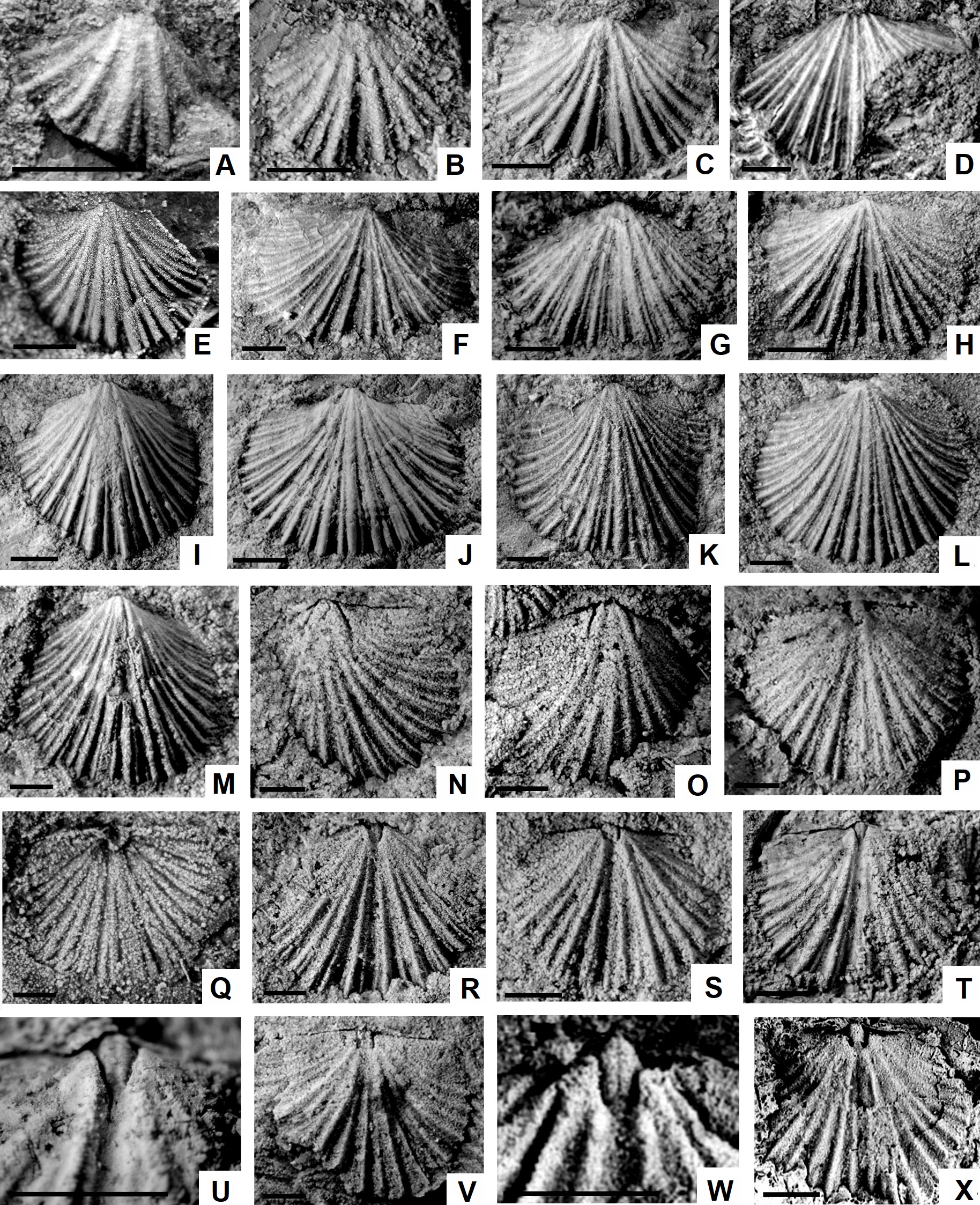 Fig. 5. Kvania lariensis from Quebrada Salto Alto, lower part of the Alfarcito Member, Santa Rosita Formation. A. Dorsal valve exterior, juvenile specimen CEGH-UNC 27670. B. Dorsal valve exterior, young adult specimen, CEGH-UNC 2776. C. Dorsal valve exterior, CEGH-UNC 27662. D. Dorsal valve exterior, CEGH-UNC 24671. E. Ventral valve exterior, latex cast CEGH-UNC 27775. F. Dorsal valve exterior, CEGH-UNC 27663. G. Dorsal valve exterior, CEGH-UNC 27773. H. Dorsal valve exterior, CEGH-UNC 27661a. I. Ventral valve exterior CEGH-UNC 27672. J. Ventral valve exterior, CEGH-UNC 27660. K. Ventral valve exterior CEGH-UNC 27673. L. Ventral valve exterior CEGH-UNC 27661b. M. Ventral valve exterior CEGH-UNC 27669. N. Ventral valve interior, CEGH-UNC 27664b. O. Ventral valve internal mold, CEGH-UNC 27665a. P-Q. Dorsal valve internal mold and latex cast CEGH-UNC 27667. R. Dorsal valve interior CEGH-UNC 27665b. S. Dorsal valve interior CEGH-UNC 27674. T-U. Dorsal valve interior, and detail of cardinalium, CEGH-UNC 27668. V. Dorsal valve interior, CEGH-UNC 27664a. W-X. Kvania lariensis, specimens from the Las Vicuñas Formation (Quebrada Lari). W. Dorsal valve latex cast, detail of cardinalium, CEGH-UNC 18951. X. Internal mold of dorsal valve, holotype CEGH-UNC 18948b (from Benedetto, 2007b). Scale bars represent 1 mm. Figured specimens prefixed CEGH-UNC are stored in the paleontological collection of CICTERRA (Centro de Investigaciones en Ciencias de la Tierra, CONICET-UNC), Córdoba, Argentina.