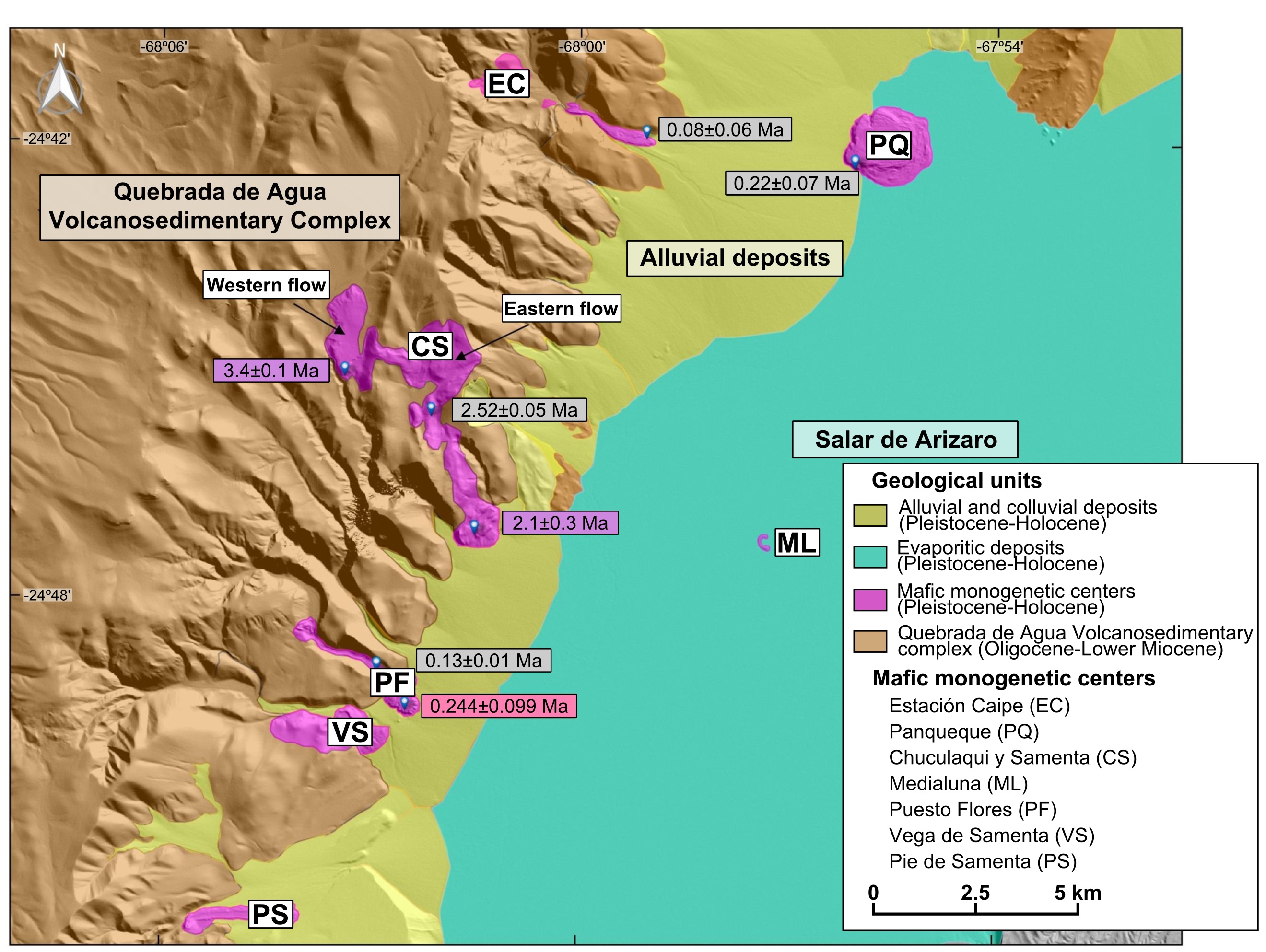 Fig. 2. Simplified geological map of the southwestern margin of the Salar de Arizaro (modified from Zappettini and Blasco, 2001) showing locations of mafic monogenetic centers and available 40Ar/39Ar ages (see Fig. 1C for map location). Four ages (light gray background) are from Schoenbohm and Carrapa (2015), two (purple background) are from Maisonnave and Poma (2016), and one (pink background) is from Maisonnave (2016). Background image is a TanDEM-X 12 m DEM-derived shaded relief. |