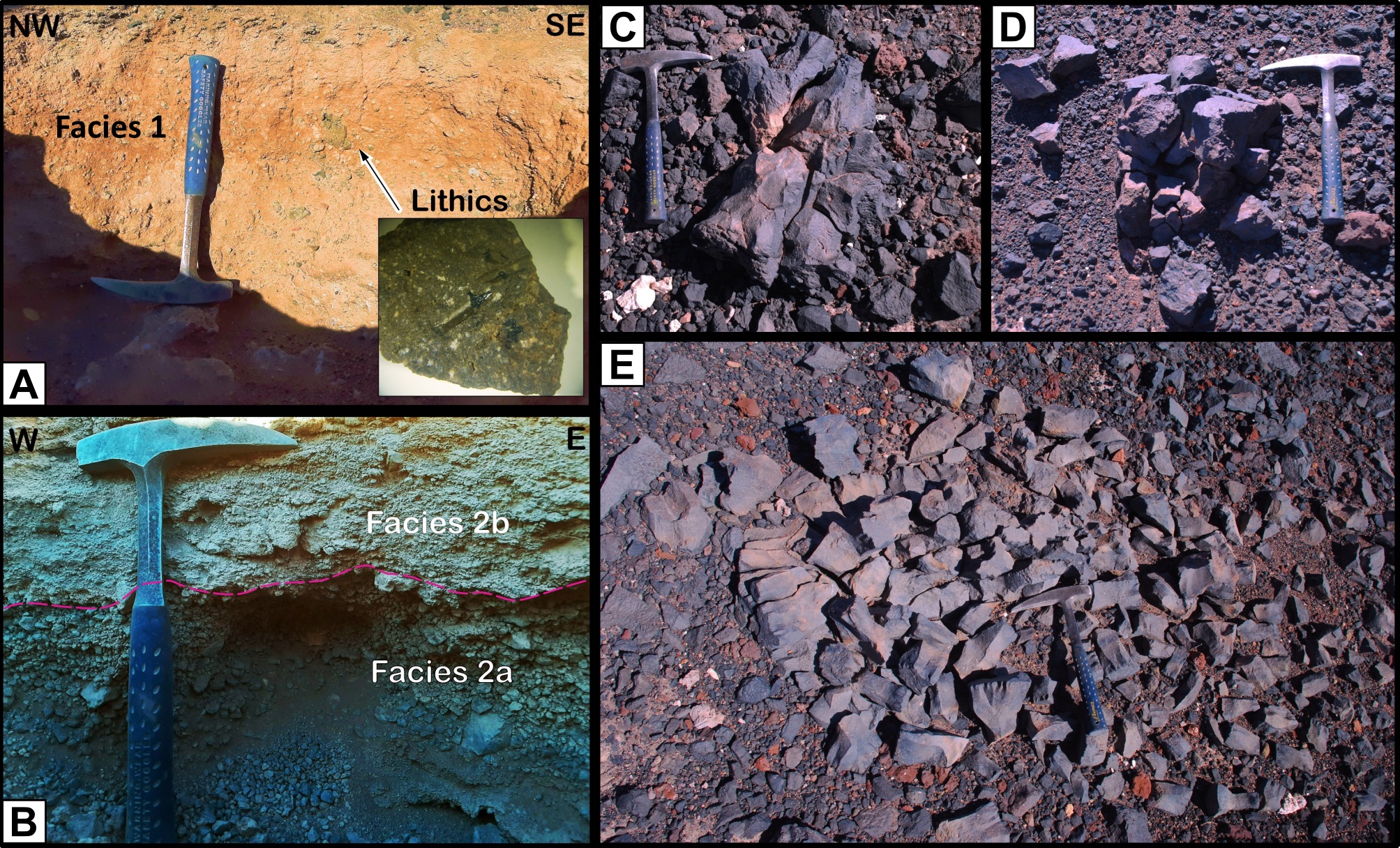 The profile excavated in the Cone 1 deposit (42 cm) consists of two facies separated by an erosive contact, a lower clast-supported lapilli facies (Facies 2a), and an upper massive lapilli and ash facies (Facies 2b) (Fig. 5B). The gray-colored lower facies, >25 cm thick (unexposed base), is composed of fine-to-mid lapilli with 1 to 3 cm sized juvenile black clasts. The beige-colored upper facies is 17 cm thick and is composed of mid-coarse ash to mid-lapilli with 1.5 to 3 cm sized juvenile black and accidental clasts.