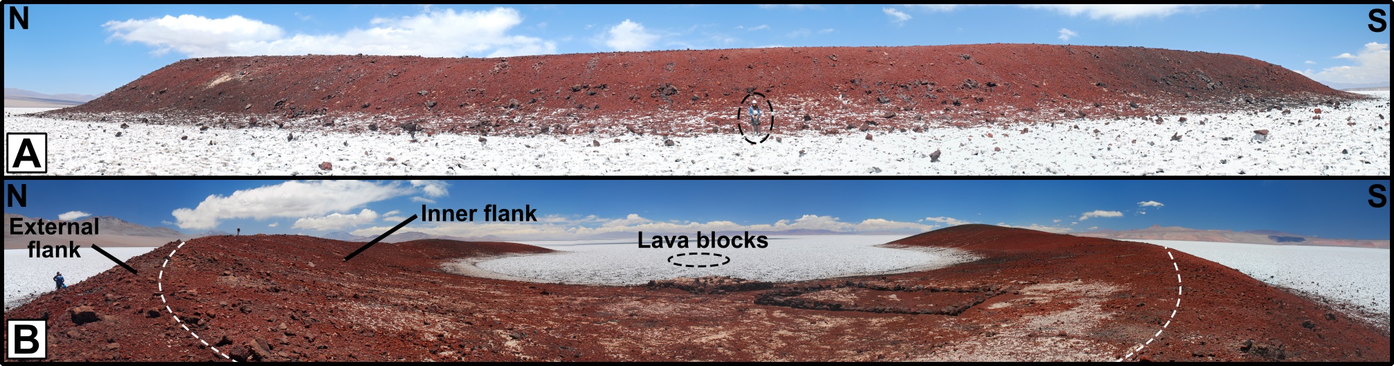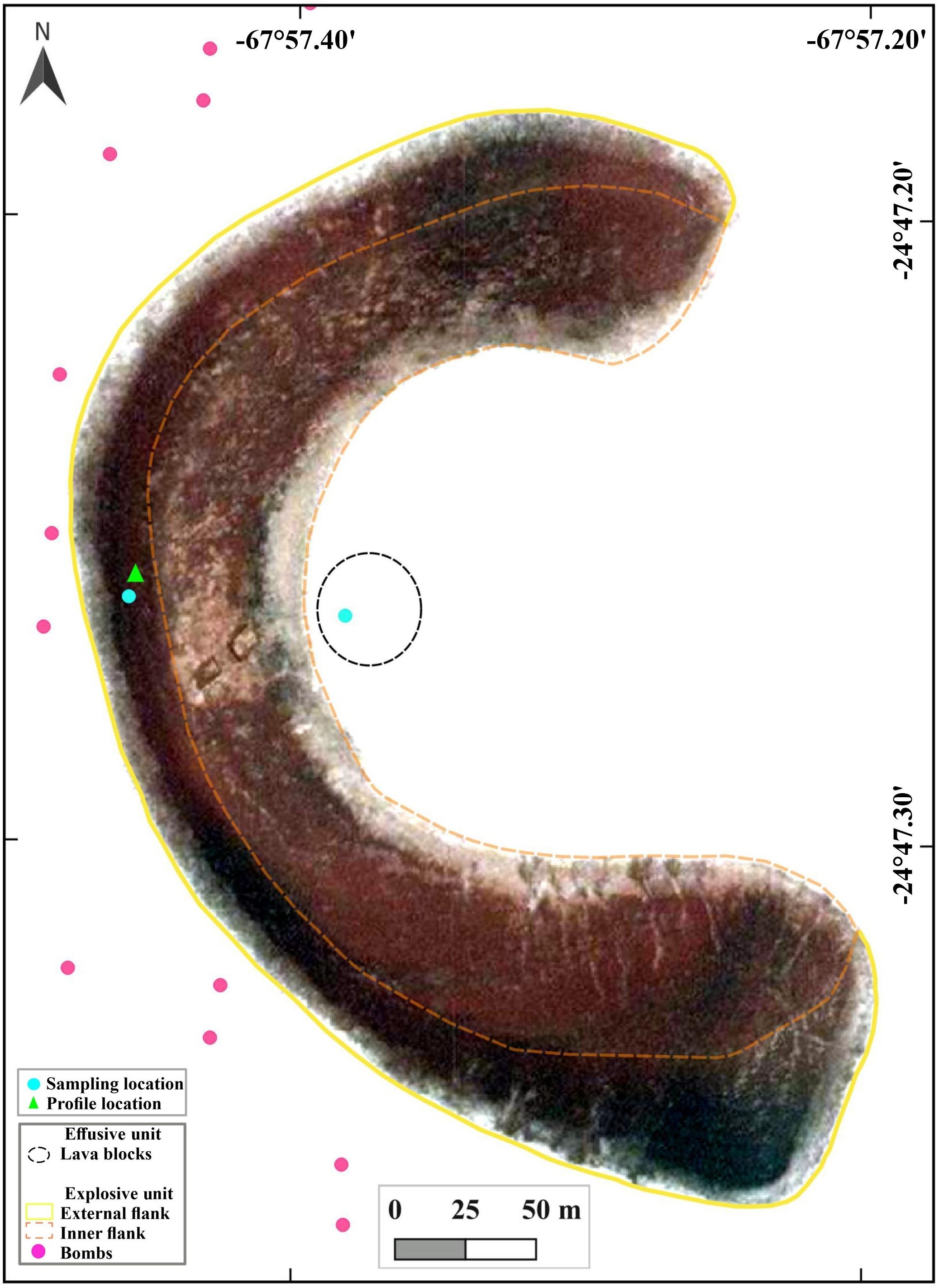 The Medialuna center consists of a main explosive unit and a minor effusive unit (Fig. 9). The explosive unit is formed by pyroclastic deposits that make up the whole crescent-shaped landform, whereas the effusive unit consists of loose lava blocks east of the inner flank, scattered on top of the salar (Fig. 9).