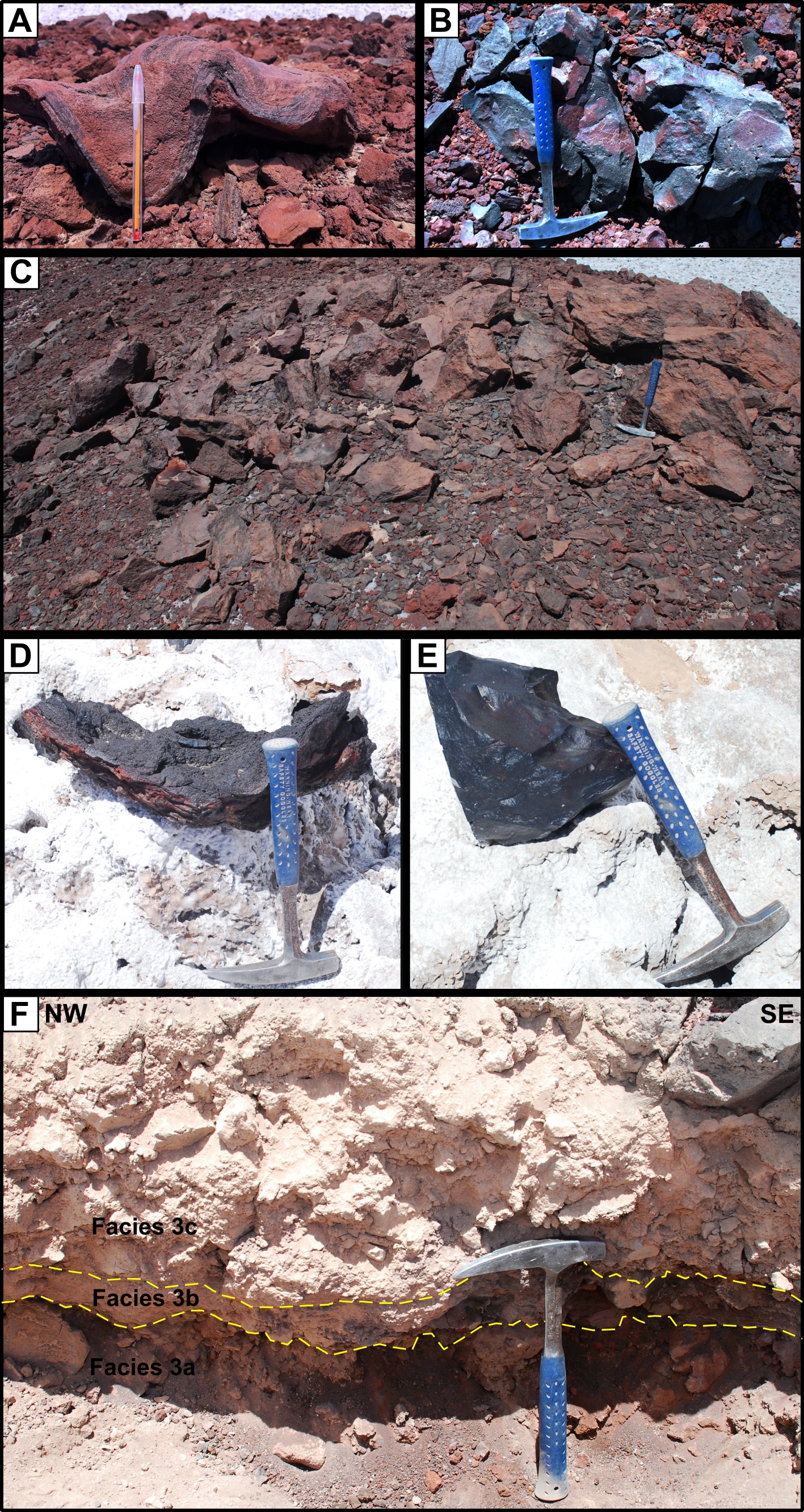 The excavated profile of the explosive unit (54 cm) has three facies (Fig. 11F), a lower, clast-supported lapilli and bomb facies (Facies 3a), an intermediate, clast-supported lapilli with intercalations of laminated ash facies (Facies 3b), and an upper, matrix-supported lapilli and bomb facies (Facies 3c). Facies 3a has a minimum thickness of 12 cm (unexposed base) and consists of coarse lapilli to block-sized juvenile clasts (dense and vesiculated) and aggregates (juvenile clasts adhered to gypsum and ash) in a very coarse reddish ash matrix. Facies 3b is 14 cm thick and consists of clast-supported fine-to-coarse lapilli, where the clasts are dense and vesiculated fragments. Part of this facies shows diffuse lamination. Facies 3c has a thickness of up to 28 cm. It contains lapilli to bomb-sized clasts of dense and vesiculated fragments, in a medium to coarse matrix.