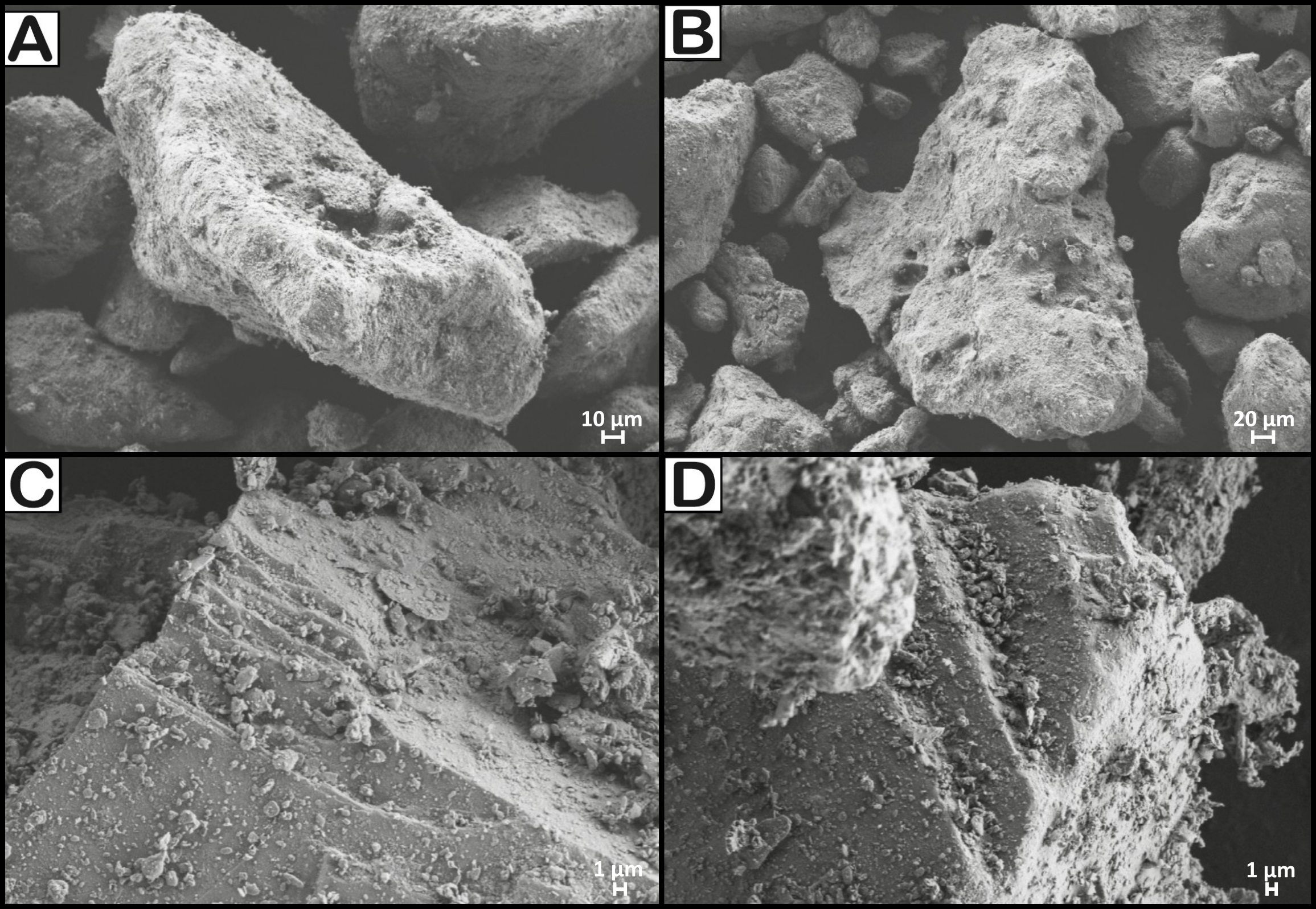 Figure 7 shows SEM images of the fine to very fine ash fractions. Clasts are mostly poorly vesiculated and have blocky morphologies. They generally show rugged and irregular surfaces, and sub-angular, dented or concave-convex edges. Some clasts have step-like surfaces and moss-like aggregates are also found. Clasts are often covered by smaller particles adhered to their surfaces.