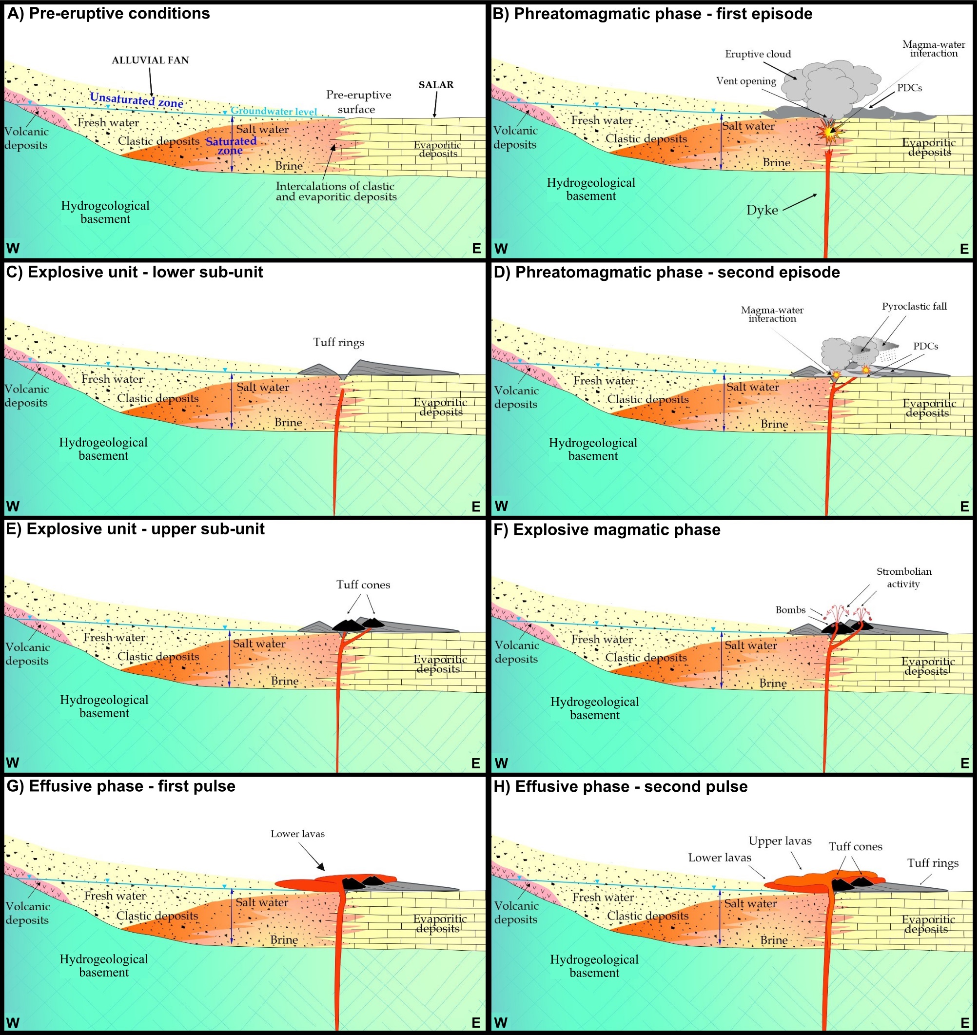 Fig. 14. Reconstruction of the eruptive history of the Panqueque mafic center (not to scale). A. Interdigitation between an alluvial fan and the Salar de Arizaro; conceptual model modified from García et al. (2016). B. Initial phreatomagmatic activity with vent opening/excavation and generation of PDCs. C. Formation of a complex tuff ring or rings. D. Second phreatomagmatic pulse generating pyroclastic fall and PDCs. E. Formation of tuff cones on top of the tuff ring(s). F. Strombolian activity with emplacement of bombs and pyroclastic fragments on the cones. G. First effusive pulse forming the lower lava flows. H. Second effusive pulse forming the upper lava flows. |