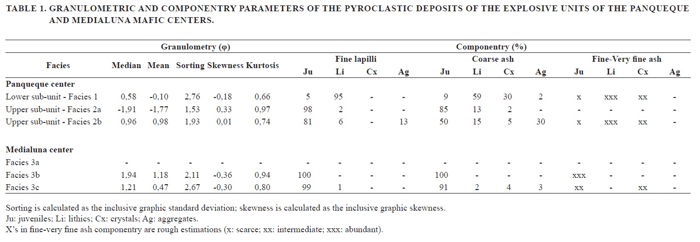 Table 1 and figure 6 show granulometric distribution statistics and componentry of Facies 1 of the lower sub-unit and Facies 2a and 2b of the upper sub-unit. Facies 1 is poorly sorted and has a polymodal distribution, with a main mode in the fine ash fraction and a secondary mode in the medium lapilli fraction (Fig. 6A). Facies 2a is well sorted and has a unimodal distribution with a mode in the fine lapilli fraction and a very positive skewness (Fig. 6B). Facies 2b is also well sorted and has a symmetric unimodal distribution with a mode in the coarse ash fraction (Fig. 6C).