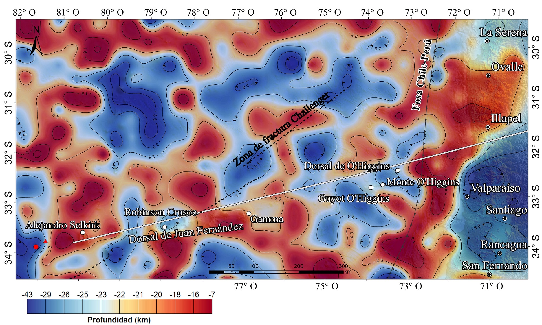 FIG. 4. Profundidad de la isoterma de Curie en la zona de estudio (reportada respecto al nivel medio del mar, isolíneas cada 5 km). Los círculos blancos indican islotes y montes submarinos de relevancia a lo largo de las dorsales de Juan Fernández y O’Higgins. Las líneas negras segmentadas muestran las zonas de fractura más importantes. La línea continua de color blanco representa la proyección de la dorsal de Juan Fernández hacia el continente, según Yáñez et al. (2001). El triángulo y el circulo de color rojo simbolizan la ubicación actual del hotspot de Juan Fernández, según Devey et al. (2000) y Lara et al. (2018), respectivamente. Batimetría y topografía obtenida mediante el modelo ETOPO2 (Amante y Eakins, 2009).