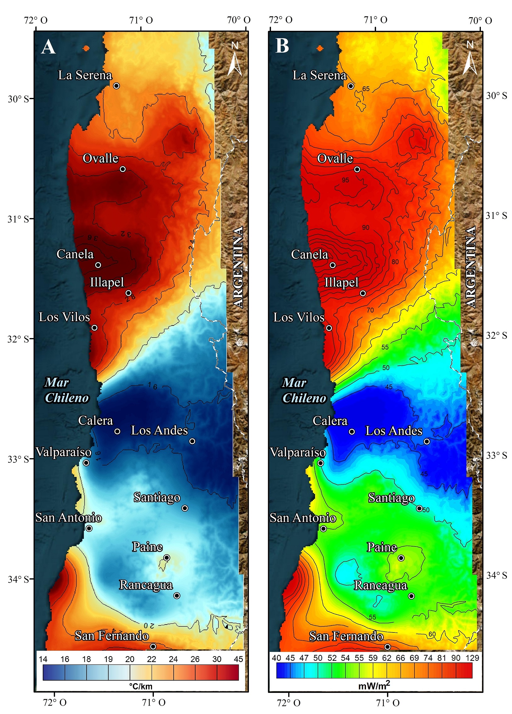 De acuerdo con el mapa de gradiente geotermal (Fig. 5A), los mayores valores se encuentran en la zona de Canela (45 °C/km) y los menores al oeste de Calera (14 °C/km ) . En las ciudades de La Serena y San Fernando se reportan valores de 23 y 25 °C/km respectivamente, mientras que la región Metropolitana posee un valor promedio de 16 °C/km , con un máximo local de 20 °C/km en la zona de Paine.