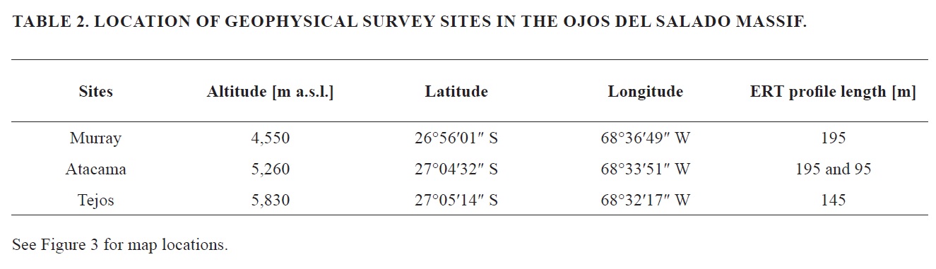 By taking together ERT analyses, subsurface frost depths, and Frost numbers, we suggest that the most probable cause for the order-of-magnitude increase in electrical resistivity from Murray to Atacama and Tejos is the increasing presence of frozen ground. It is also worth noticing that as the ERT survey took place at the end of summer, the high resistivity anomalies detected cannot be snowstorm driven.