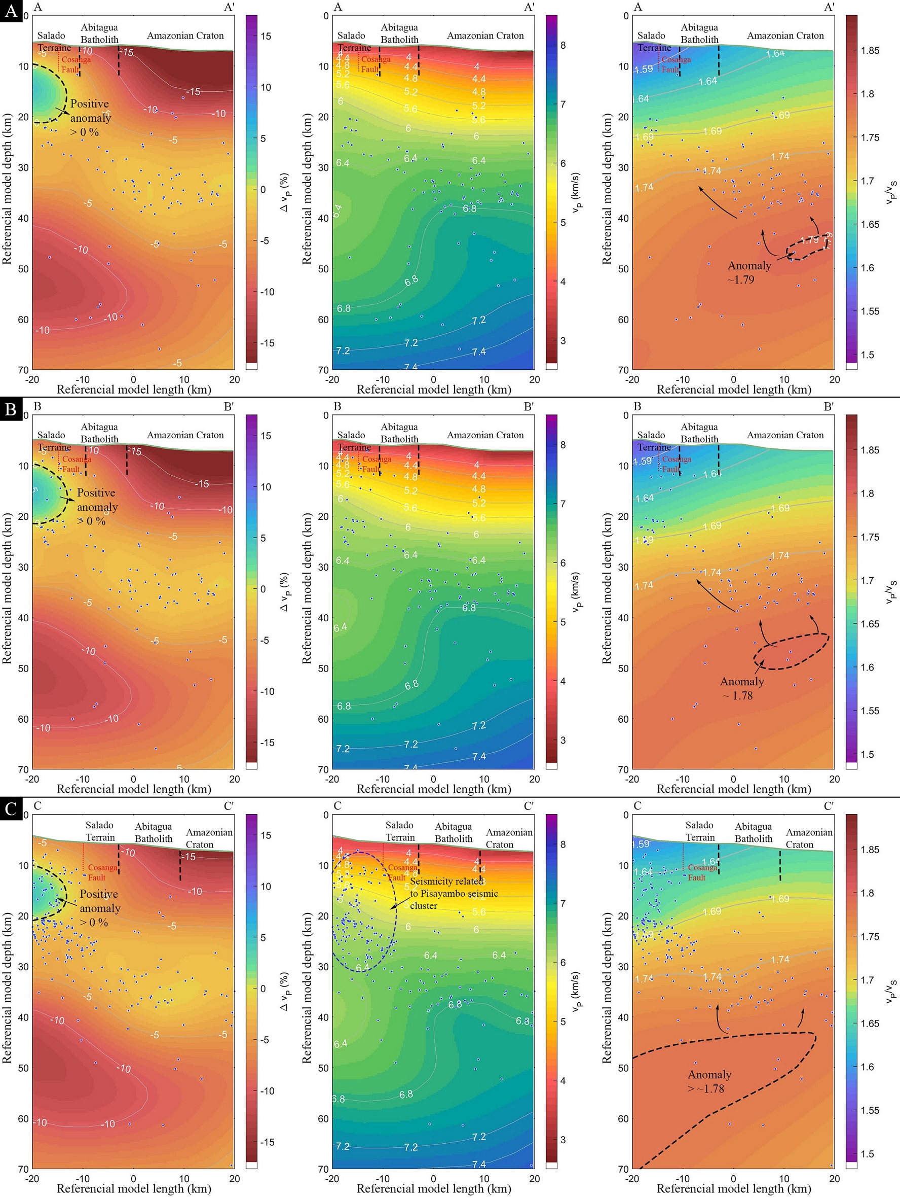 Fig. 4. Seismic model results: ΔVp (in percentage form), Vp (km/s), and Vp/Vs (dimensionless) along sections A: AA’, B: BB’, and C: CC’ (see section location in Fig. 1). Along the surface, the main morphotectonic units (after Litherland et al., 1994) are indicated. Some relevant anomalies (dotted contours) and seismic event hypocenters (blue dots) are also shown.