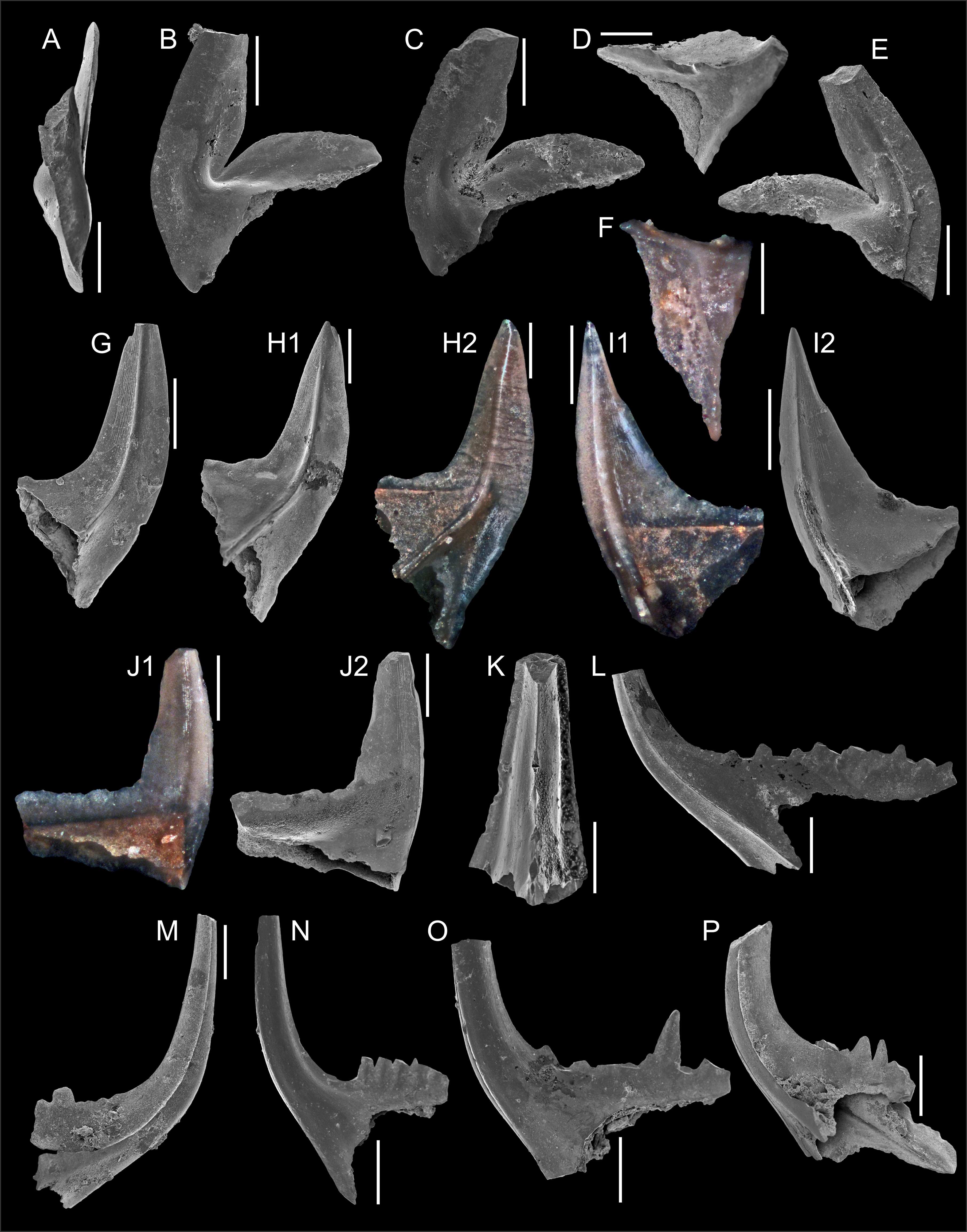 Fig. 2. SEM images (unless otherwise stated) of conodonts from the La Ciénaga de Purmamarca area. A-P. Gothodus andinus (Rao et al., 1994). A. M element, CEGH-UNC 27689; B. M element, CEGH-UNC 27690; C. M element, CEGH-UNC 27691; D. Pb element, CEGH-UNC 27692; E. M element, CEGH-UNC 27693; F. Pa element, CEGH-UNC 27694, optical image; G. Pb element, CEGH-UNC 27695; H1-H2. Pb element, CEGH-UNC 27696, H1: SEM image, H2: optical image; I1-I2. Pa element, CEGH-UNC 27697, I1: optical image, I2: SEM image; J1-J2, Pa element, CEGH-UNC 27698, J1: optical image, J2: SEM image; K. Sa element, CEGH-UNC 27699; L. Sb element, CEGH-UNC 27700; M. Sb element, CEGH-UNC 27701; N. Sc element, CEGH-UNC 27702; O. Sc element, CEGH-UNC 27703; P. Sd element, CEGH-UNC 27704. All scale bars are 100 μm.