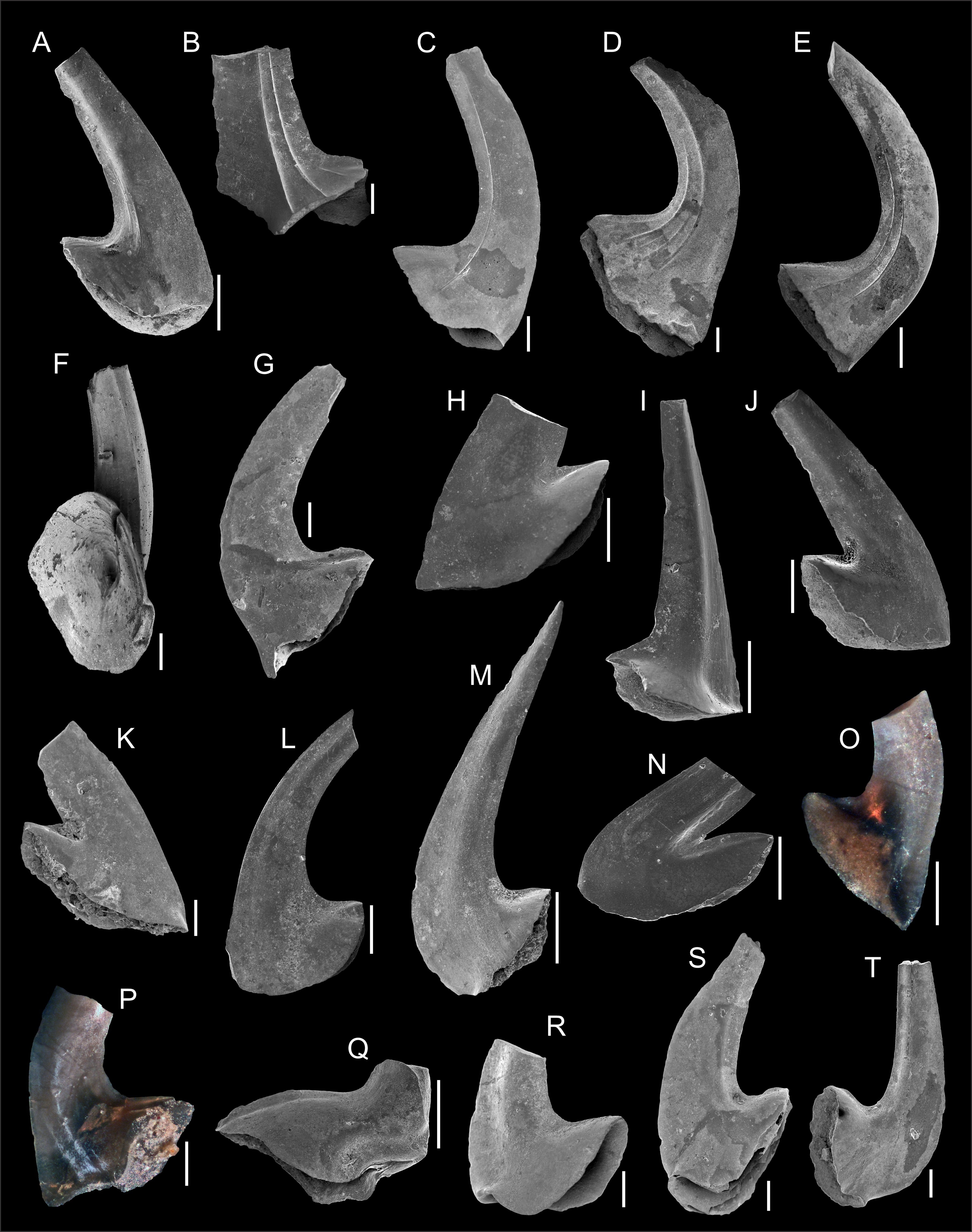 Fig. 3. SEM images (unless otherwise stated) of conodonts from the La Ciénaga de Purmamarca area. A-F. Drepanoistodus pitjanti Cooper (1981). A. M element, CEGH-UNC 27719; B. Sa element, CEGH-UNC 27720; C. Sc element, CEGH-UNC 27721; D. Sb element, CEGH-UNC 27722; E. Sd element, CEGH-UNC 27723; F. Sd element, CEGH-UNC 27724. G-K. Drepanoistodus cf. andinus Voldman et al. (2013b). G. Sb element, CEGH-UNC 27725; H. M element, CEGH-UNC 27726; I. Sa element, CEGH-UNC 27727; J. M element, CEGH-UNC 27728; K. M element, CEGH-UNC 27729. L-O. Drepanoistodus sp. A. L. Sc element, CEGH-UNC 27730; M. Sb element, CEGH-UNC 27731; N. M element, CEGH-UNC 27732; O. Pa element, CEGH-UNC 27733, optical image. P-Q. Paroistodus sp. P. S element, CEGH-UNC 27734, optical image; Q. S element, CEGH-UNC 27735. R-T. Drepanodus arcuatus Pander (1856). R. Pb element, CEGH-UNC 27736; S. Pa element, CEGH-UNC 27737; T. Pa element, CEGH-UNC 27764. All scale bars are 100 μm.