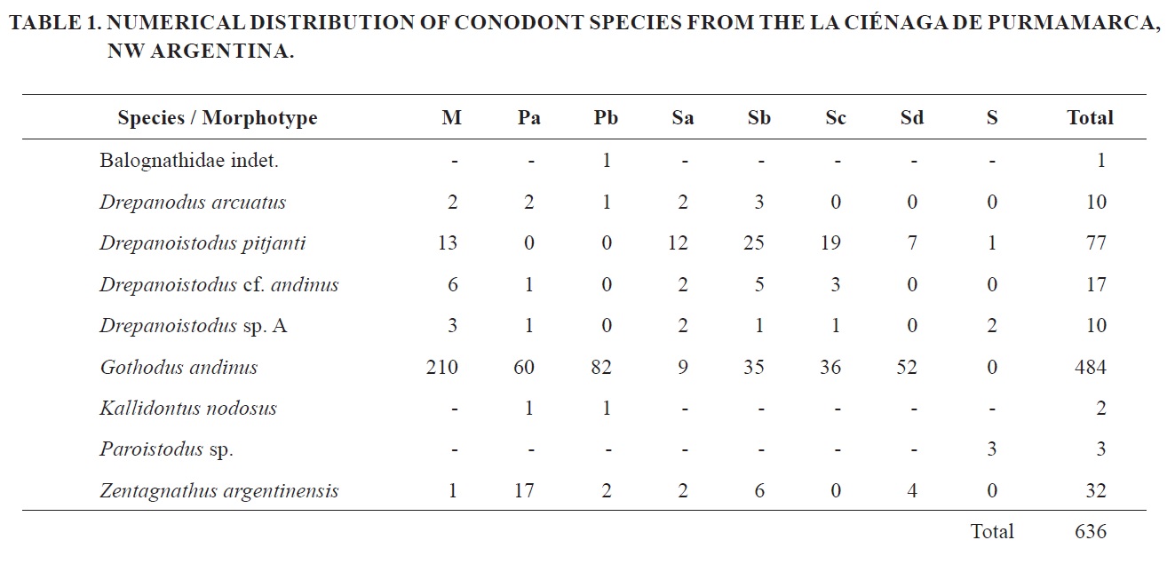 The La Ciénaga de Purmamarca is a classical locality for the study of the Ordovician of northwestern Argentina (Cecioni, 1953, 1965; Harrington and Leanza, 1957; Rao, 1994). In this contribution, the analyzed rock sample (geographical coordinates: 23°42’ S, 65°32.7’ W; Fig. 1B) is a phosphatized, highly fossiliferous matrix-supported calcareous coquina that includes conodonts, cnidarians, linguliform and rhynchonelliform brachiopods, hyoliths, mollusks (gastropods, bivalves, and cephalopods), as well as remnants of trilobites, ostracods and echinoderms. From this same bed, the raphiophorid trilobite Pytine wirayasqa Vaccari et al. (2006) was originally defined. 1,700 g of sample were fragmented and dissolved in buffered acetic acid following the standard conodont recovery techniques (Stone, 1987; Jeppsson et al., 1999), obtaining 636 conodont elements (Table 1).