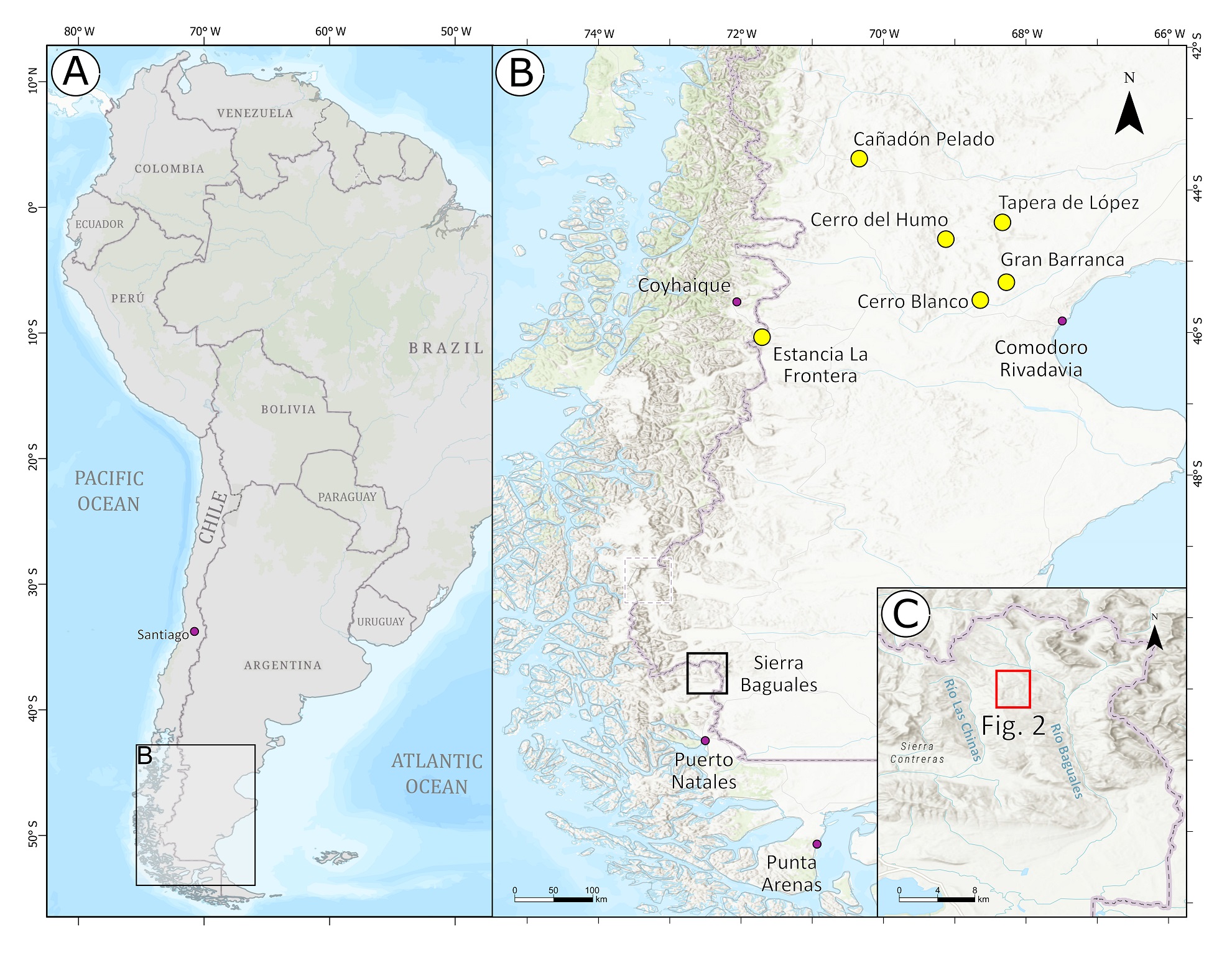 Fig. 1. Geographic context and study area. A. Map of South America demarking in inset B central and southern Patagonia. B. Detail of the localities (yellow circles) in which Albertogaudrya unica has been previously recorded in central Patagonia. The black square denotes Sierra Baguales that is detailed in inset C. Main cities are denoted by purple circles. C. Geographic map of Sierra Baguales, Magallanes, Chile, and detailed study area (red square) expanded in figure 2. Key cities are shown as purple circles. The hillshade basemap was obtained from the free repository of ArcGIS Pro 3.1, built over the ALOS PALSAR shuttle mission, the GeoEYE Satellite constellation and the USGS database.