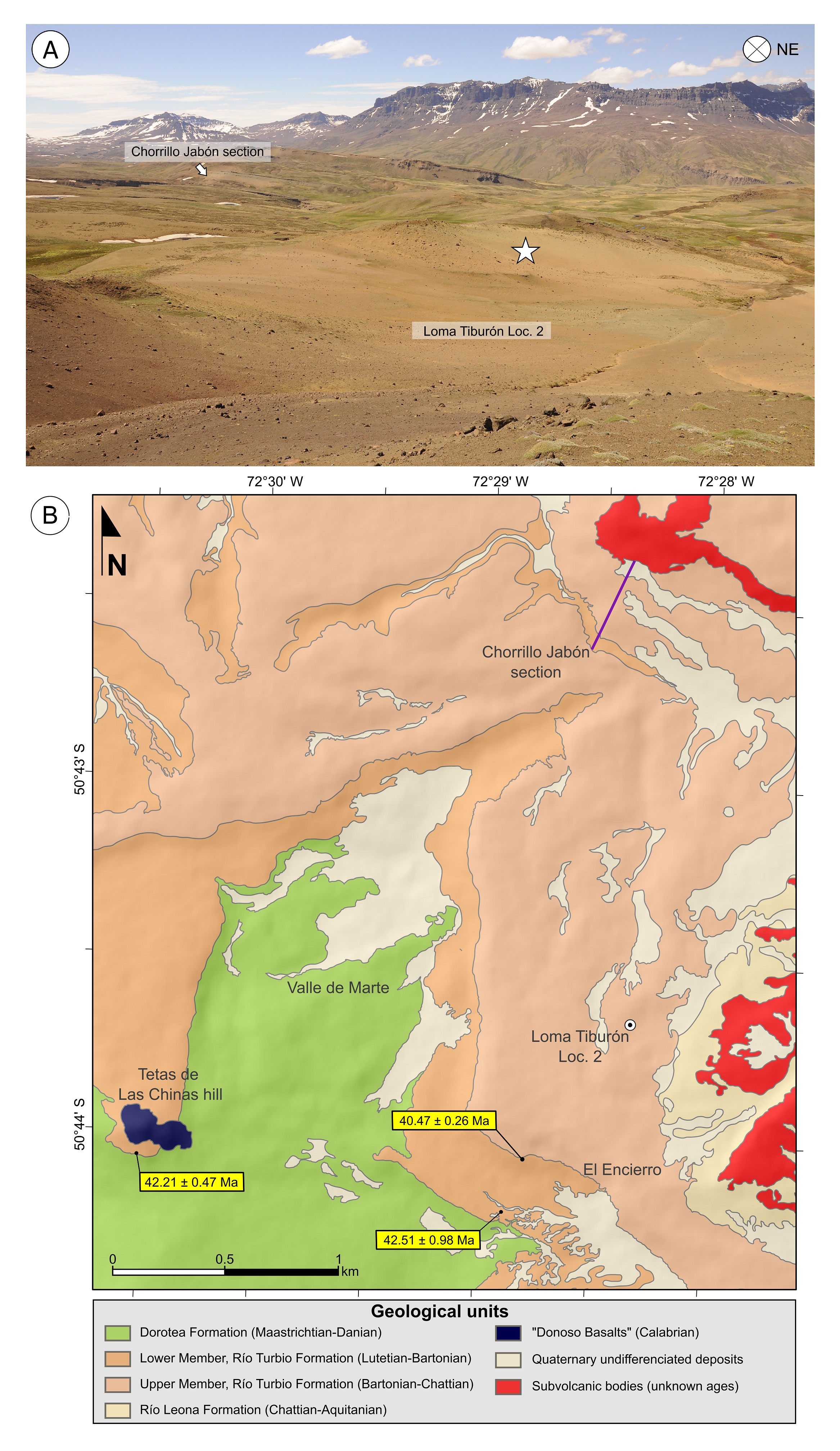 Fig. 2. A. Panoramic view towards the northeast of Loma Tiburón Locality 2, with eroded outcrops of the Upper Member of the Río Turbio Formation. The white star marks the location where FMHN.PV.850 was collected. Photograph courtesy of José Luis Oyarzún Barría. B. Geologic map of the study area in Sierra Baguales with discussed locations, dates, and geographic references. The Purple bar denotes the Chorrillo Jabón stratigraphic section of Alarcón (2020). Yellow boxes depict sample locations of George et al. (2020) with published detrital zircon U-Pb ages in the area, expressed as weighted maximum depositional ages MDAs.