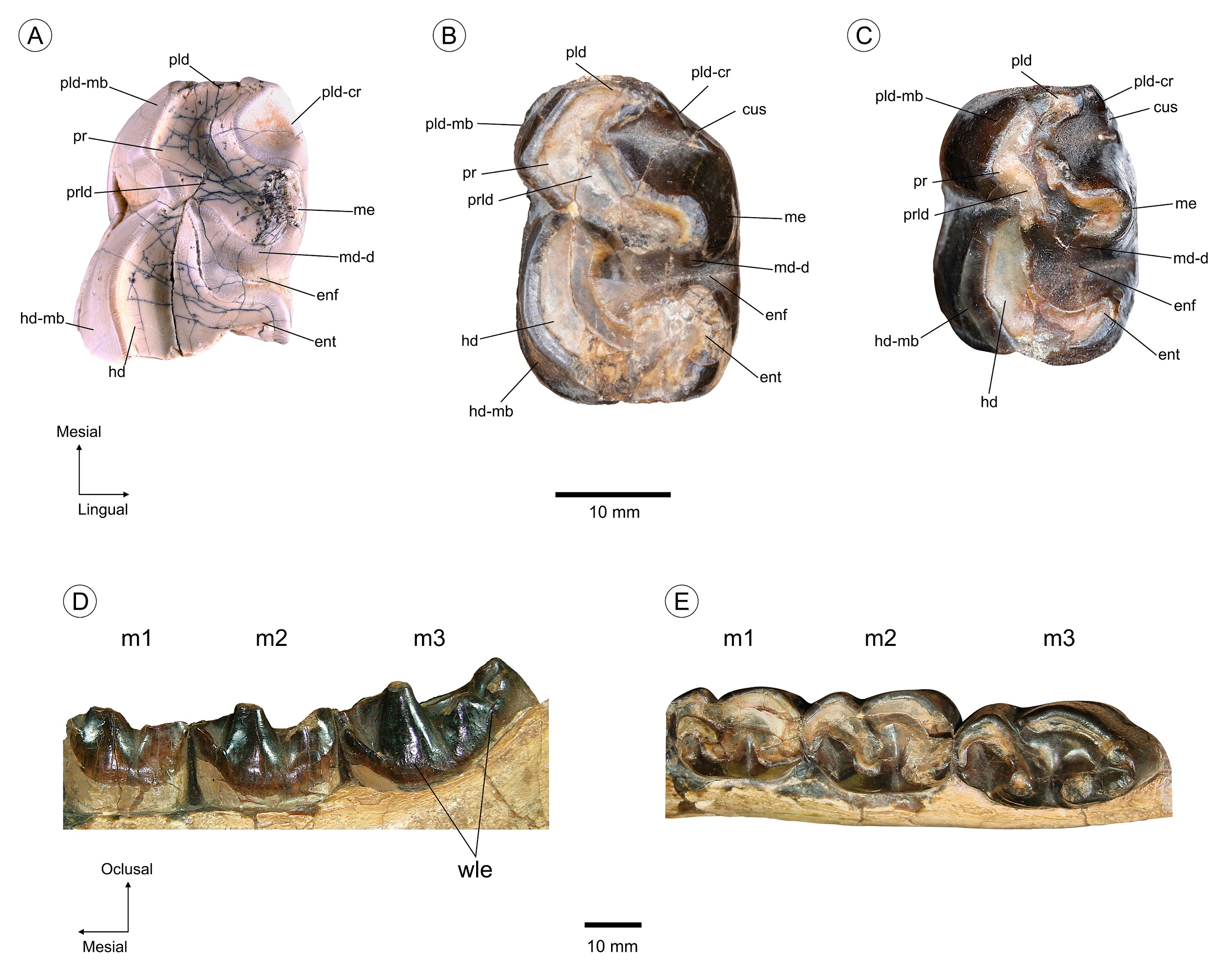 Anatomical abbreviations: co: cristid obliqua, cus: cuspule, enf: entoflexid, ent: entoconid, hd: hypoconid, hd-db: hypoconid distobuccal wear facet, hd-mb: hypoconid mesiobuccal wear facet, hyf: hypoflexid, lac: labial cingulid, m: lower molar, md-d: metaconid distal wear facet, me: metaconid, pld: paralophid, pld-cr: paralophid lingual cristid, pld-mb: paralophid mesiobuccal wear facet, pr: protoconid, pr-db: protoconid distobuccal wear facet, prld: protolophid, wle: wrinkled lingual enamel.